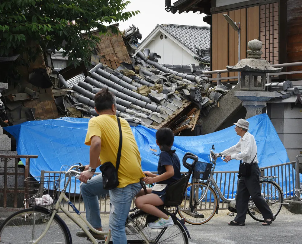 People pause to look at a collapsed house following an earthquake in Ibaraki City, north of Osaka prefecture on June 18, 2018. At least two people, including a child, were killed on June 18, after a strong quake rocked the second city of Osaka during the morning rush hour, Japan's government said. (Photo by AFP Photo/JIJI Press)