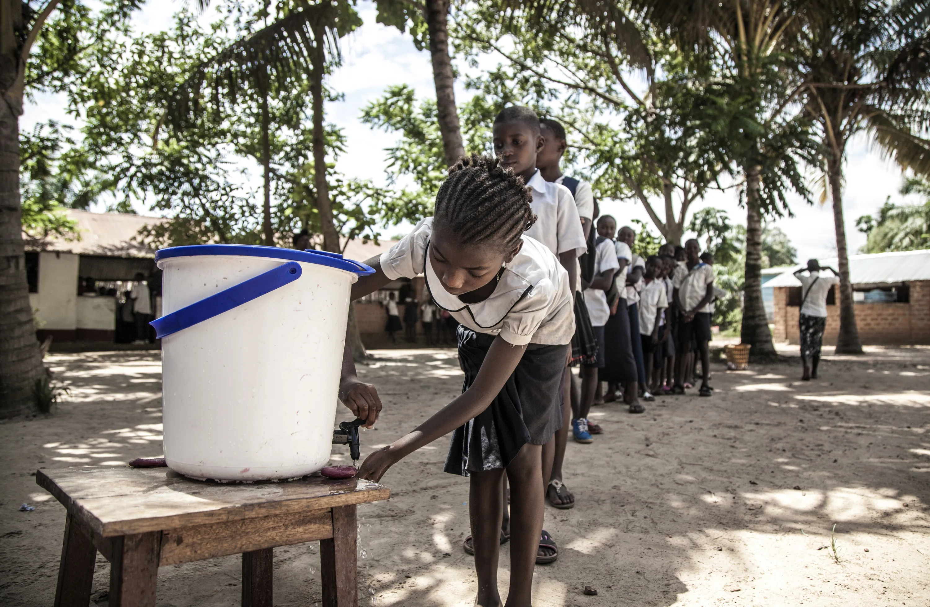 In this May 22, 2018 photo provided by UNICEF, schoolchildren wash their hands to help contain the Ebola outbreak before entering a classroom in the north-western city of Mbandaka, in Congo. Congo's health ministry announced six new confirmed Ebola cases and two new suspected cases Tuesday as vaccinations entered a second day in an effort to contain the deadly virus in the city of more than 1 million. (Photo by Mark Naftalin/UNICEF via AP Photo)
