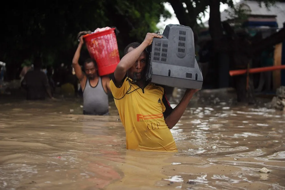 A man carries a television through waist-deep flood water in Mogadishu on May 20, 2018 after homes were inundated in Somalia's capital following heavy overnight rainfall. (Photo by Mohamed Abdiwahab/AFP Photo)