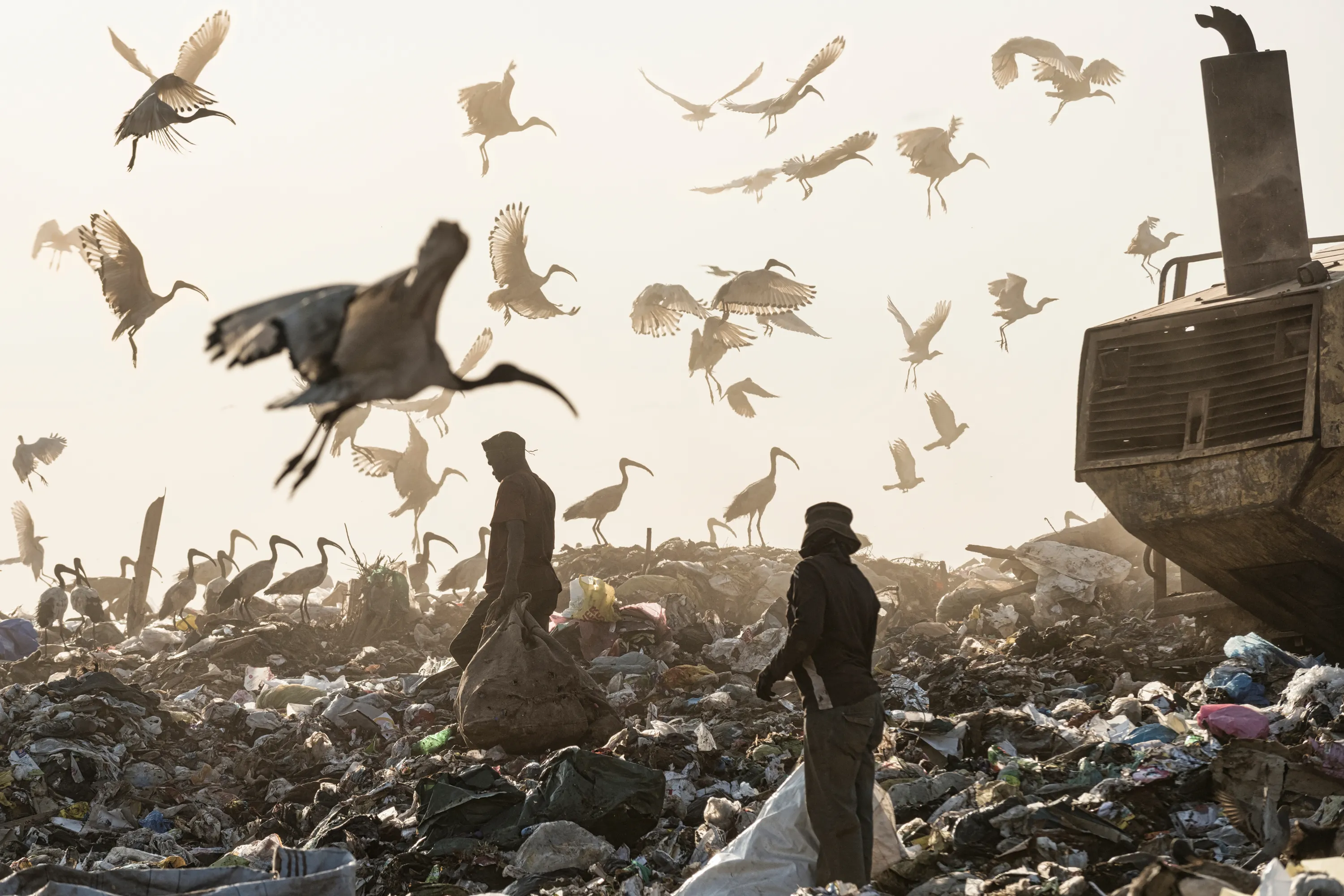 Recyclers and birds scour the Robinson Deep landfill at the edge of the city Johannesburg, South Africa on April 29, 2018. (Photo by Graham De Lacy/Greatstock/Barcroft Images)