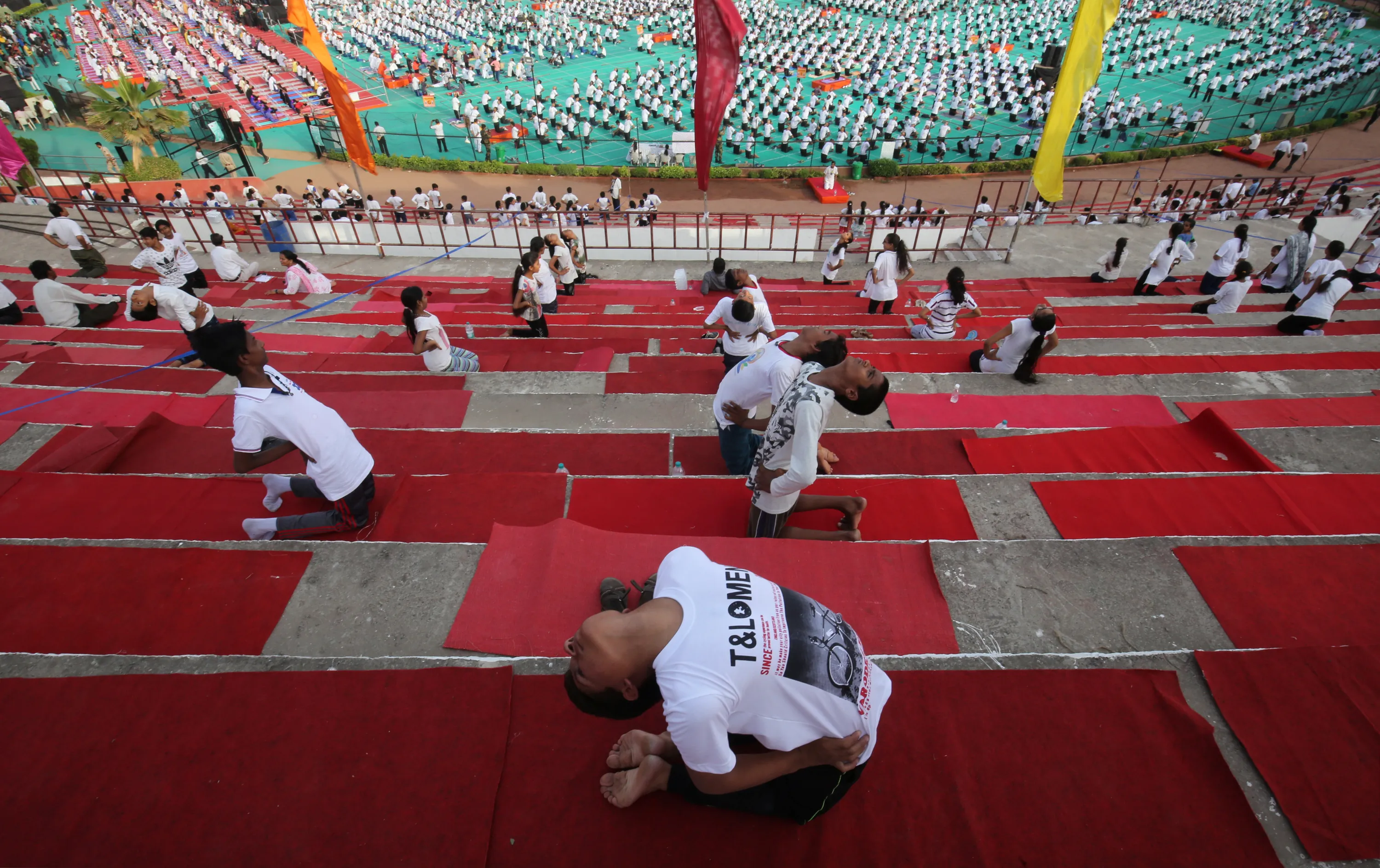 Participants perform yoga at a stadium during International Yoga Day in Ahmedabad, India, June 21, 2018. (Photo by Amit Dave/Reuters)