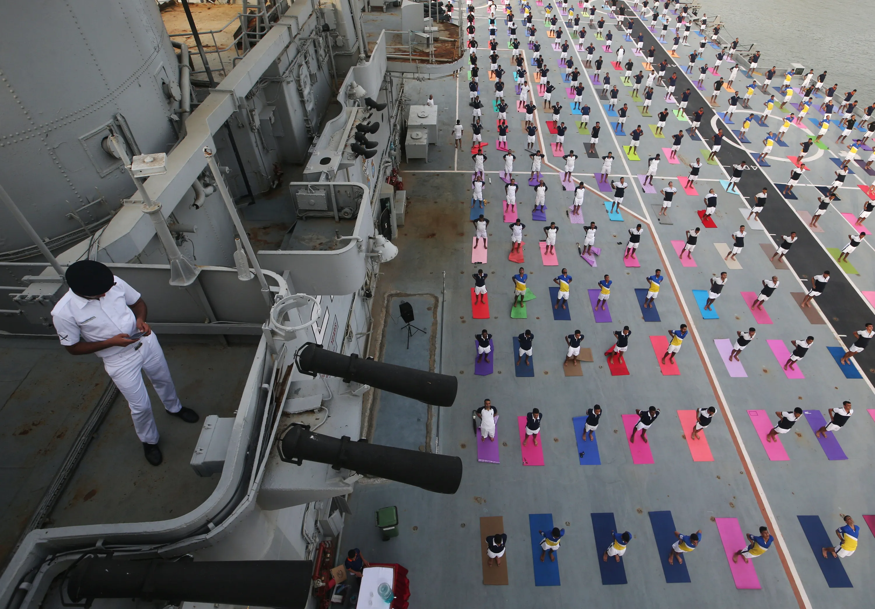 Members of the Indian Navy perform yoga on the flight deck of INS Viraat, an Indian Navy's decommissioned aircraft carrier, during International Yoga Day in Mumbai, India on June 21, 2018. (Photo by Francis Mascarenhas/Reuters)