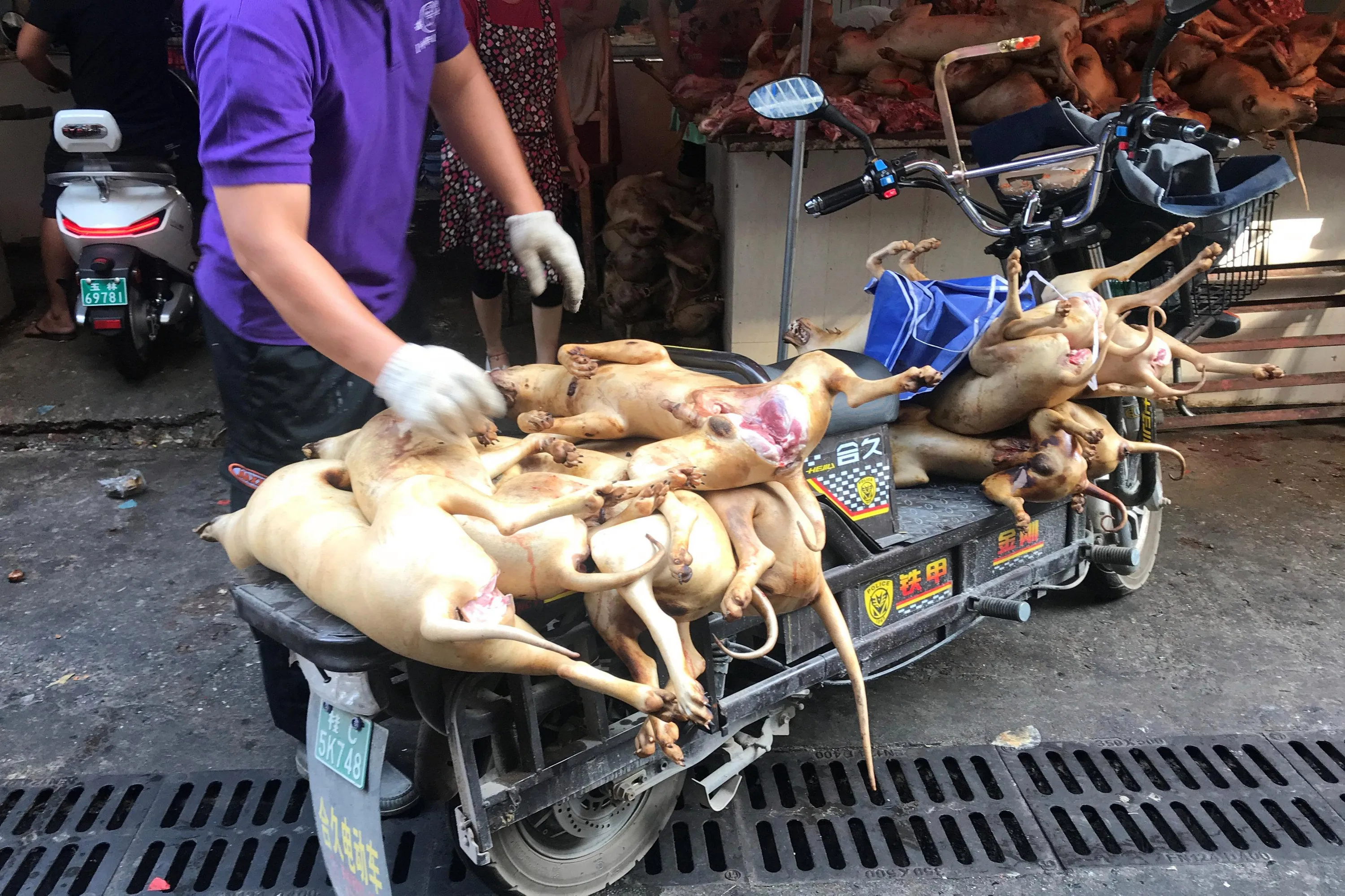 Butchered dogs are transport to a vendor's stall at a dog meat market ahead of a local dog meat festival in Yulin, Guangxi Autonomous Region, China on June 20, 2018. The event is popular with hungry locals who believe the traditional meat is good for the body. It can be traced back to 2009 and it is believed 10,000 dogs – many of them stolen and strays – were killed for previous festivals. But the gala been slammed by animal rights activists who are seeking new ways to pressurise organisers to cancel the annual festival. Residents in the southern city defended eating the meat to celebrate the summer solstice on Thursday. The 10-day event, dubbed the lychee and dog meat festival by residents, has become a symbol of hatred for dog lovers, who every year confront those who buy, sell and eat canines. In recent years, activists have raided slaughterhouses and intercepted truckloads of dogs in efforts to limit the number of animals killed. They branded the dog meat trade is inhumane and unhygienic, pointing to videos of dogs caught with wire lassos, transported in tiny cages and slaughtered with metal rods. Yulin resident Wang Yue said: “Yulin's so-called lychee and dog meat festival is just a popular custom of ours. Popular customs themselves cannot be right or wrong. Those scenes of bloody dog slaughter that you see online, I want to say that the killing of any animal will be bloody. I hope people can look at this objectively”. But animal protection group Humane Society International said in a statement the festival was “manufactured” by the dog meat traders and that dog meat was not part of mainstream food culture in China. The event is not sanctioned by Yulin authorities, but police said their efforts to "maintain stability" had reduced the number of activists in the city this year. (Photo by Tyrone Siu/Reuters)