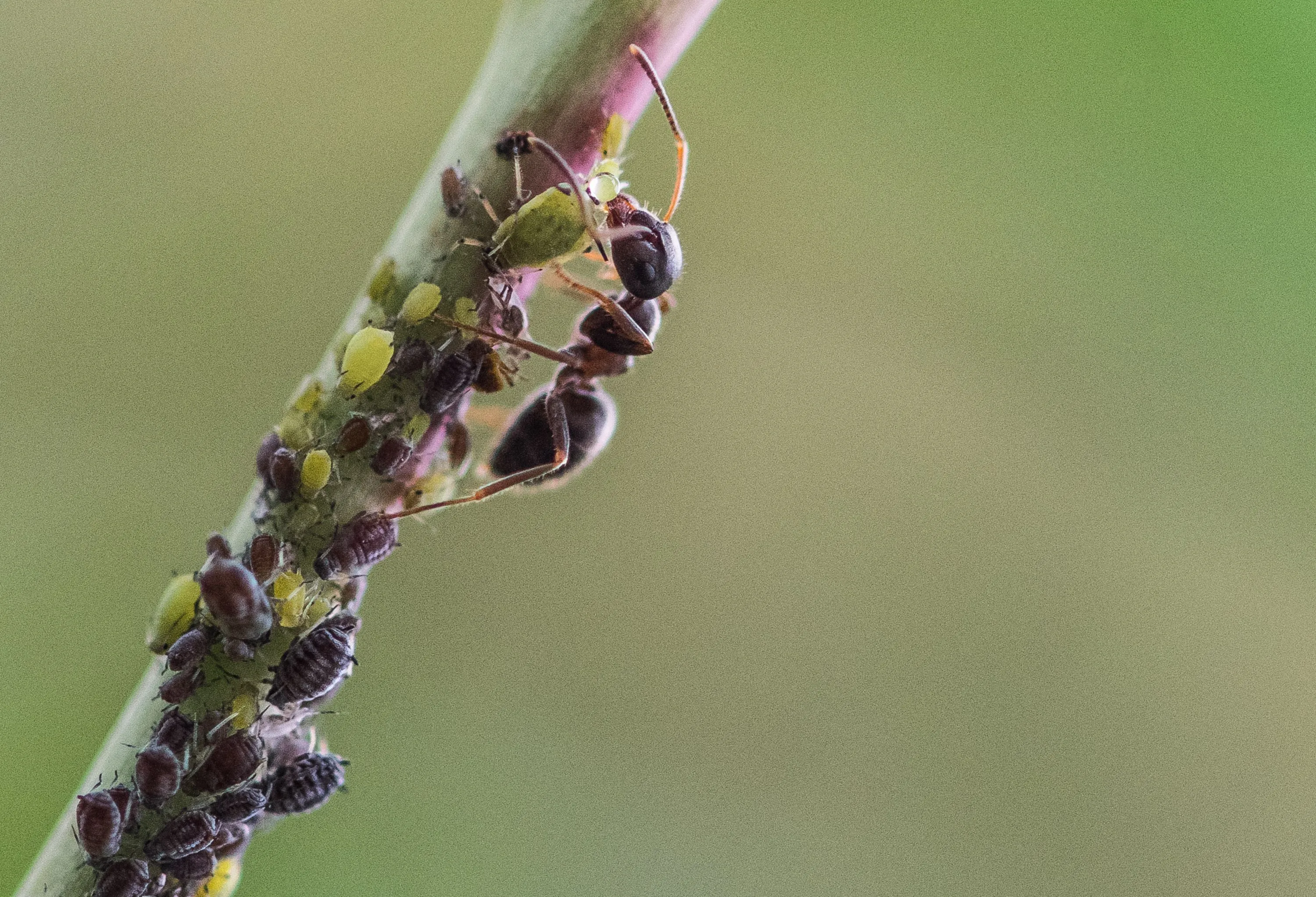 An ant milks honeydew from aphids in a garden in Rottweil, southern Germany on June 6, 2018. (Photo by Silas Stein/AFP/DPA)