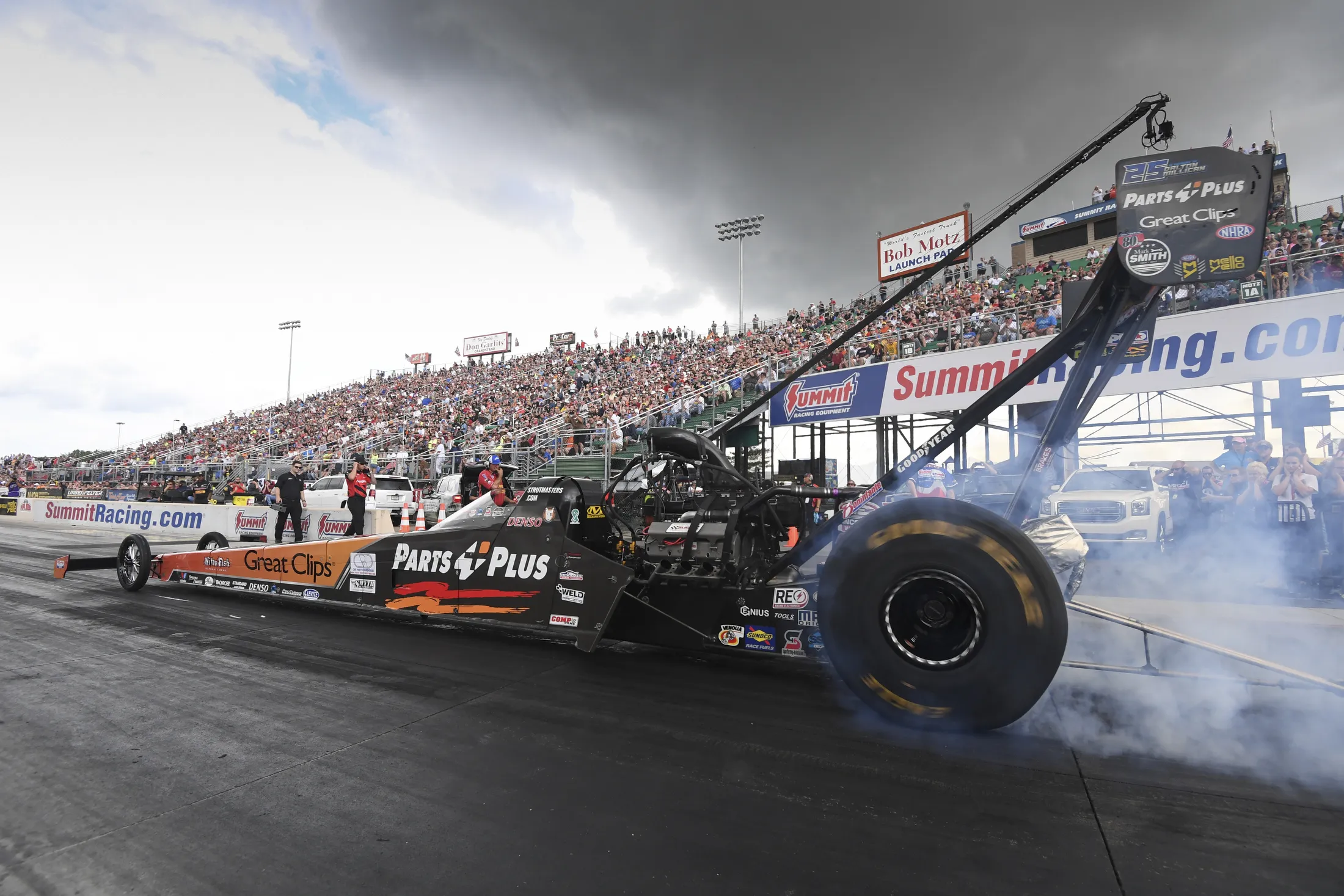 In this photo provided by the NHRA, Clay Millican does a burnout during Top Fuel qualifying Saturday, June 23, 2018, at the 12th annual Summit Racing Equipment NHRA Nationals drag races in Norwalk, Ohio. Millican used a 3.750-second pass at a track record 332.67 mph in the lone qualifying session of the day. (Photo by Jerry Foss/NHRA via AP Photo)