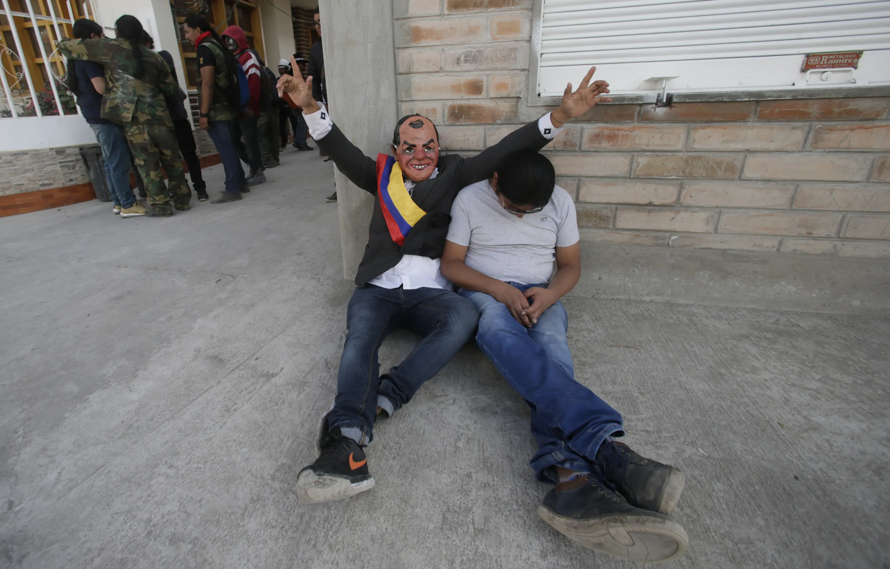 A man wearing a mask of Ecuador's former President Rafael Correa and the presidential sash gestures to the camera as a man sleeps next to him, after a day of chanting, dancing and drinking during the Sun Festival in Peguche, Ecuador, Sunday, June 24, 2018. (Photo by Dolores Ochoa/AP Photo)