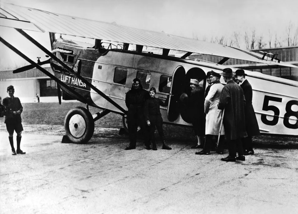 A group of passengers is boarding a Lufthansa Dornier Komet III plane, April 6, 1926, at the Tempelhof airport in Berlin, Germany. Lufthansa started its official flight service today. The flight route has stopovers in Halle, Erfurt, Stuttgart and final destination Zurich, Switzerland.. (Photo by AP Photo)