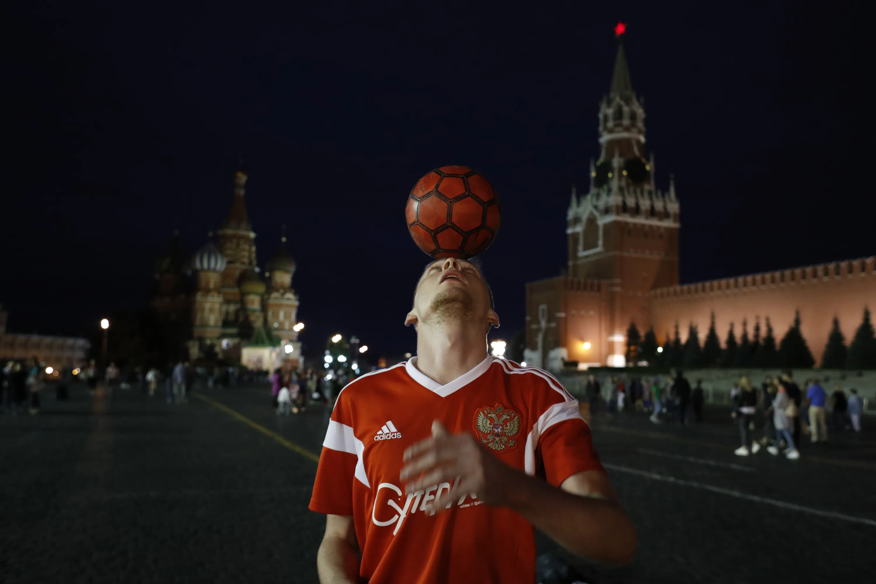 A Russian soccer fan shows off his ball skills as he plays with tourists and soccer fans in Red Square during the 2018 soccer World Cup in Moscow, Russia, Tuesday, July 3, 2018. (Photo by Hassan Ammar/AP Photo)