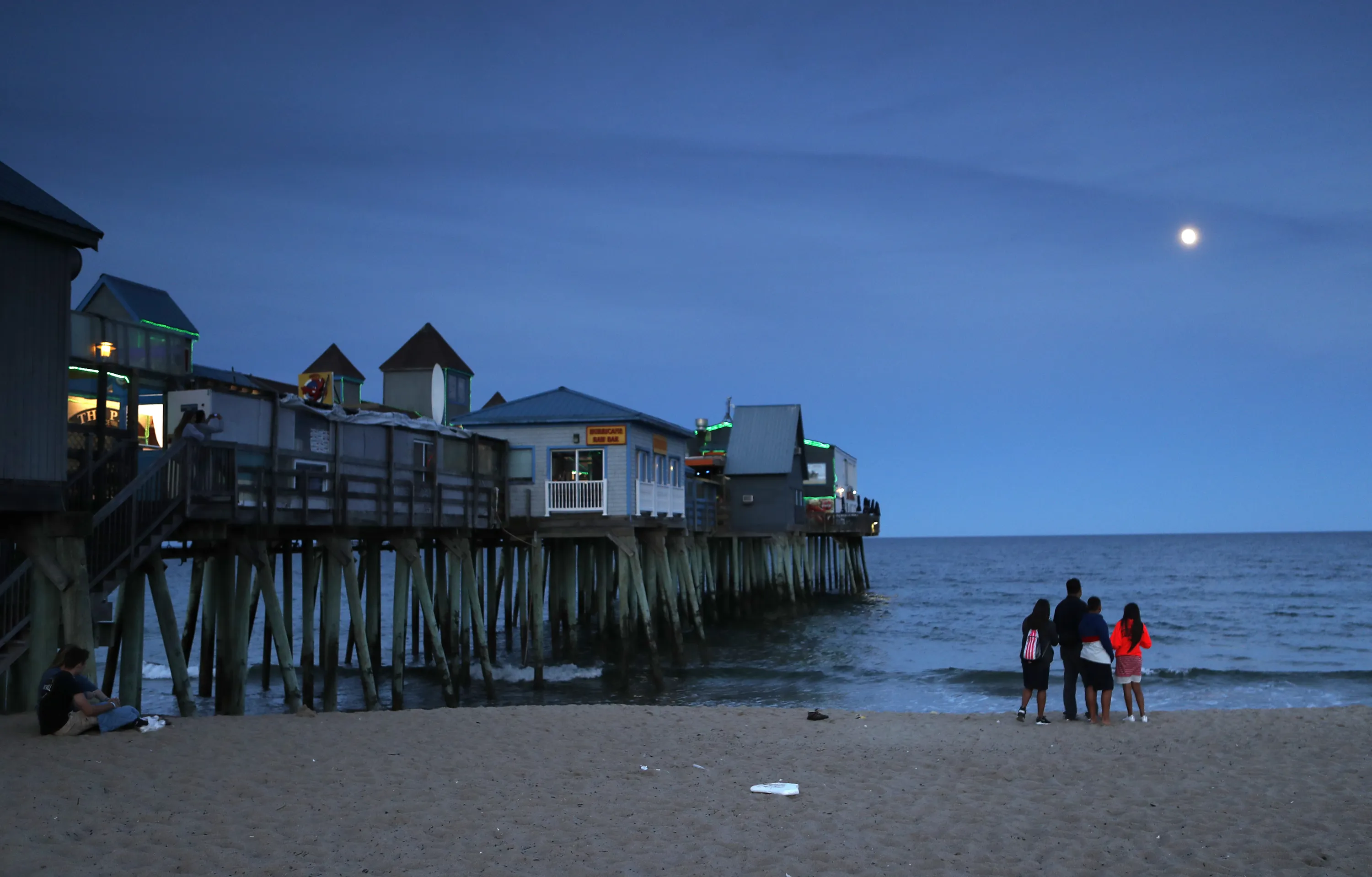 Vacationing tourists watch the moon rise over the Atlantic Ocean near The Pier in Old Orchard, Beach, Maine, Tuesday, June 26, 2018. Old Orchard Beach has long been a popular summer destination for French-speaking Canadians from Quebec. (Photo by Robert F. Bukaty/AP Photo)