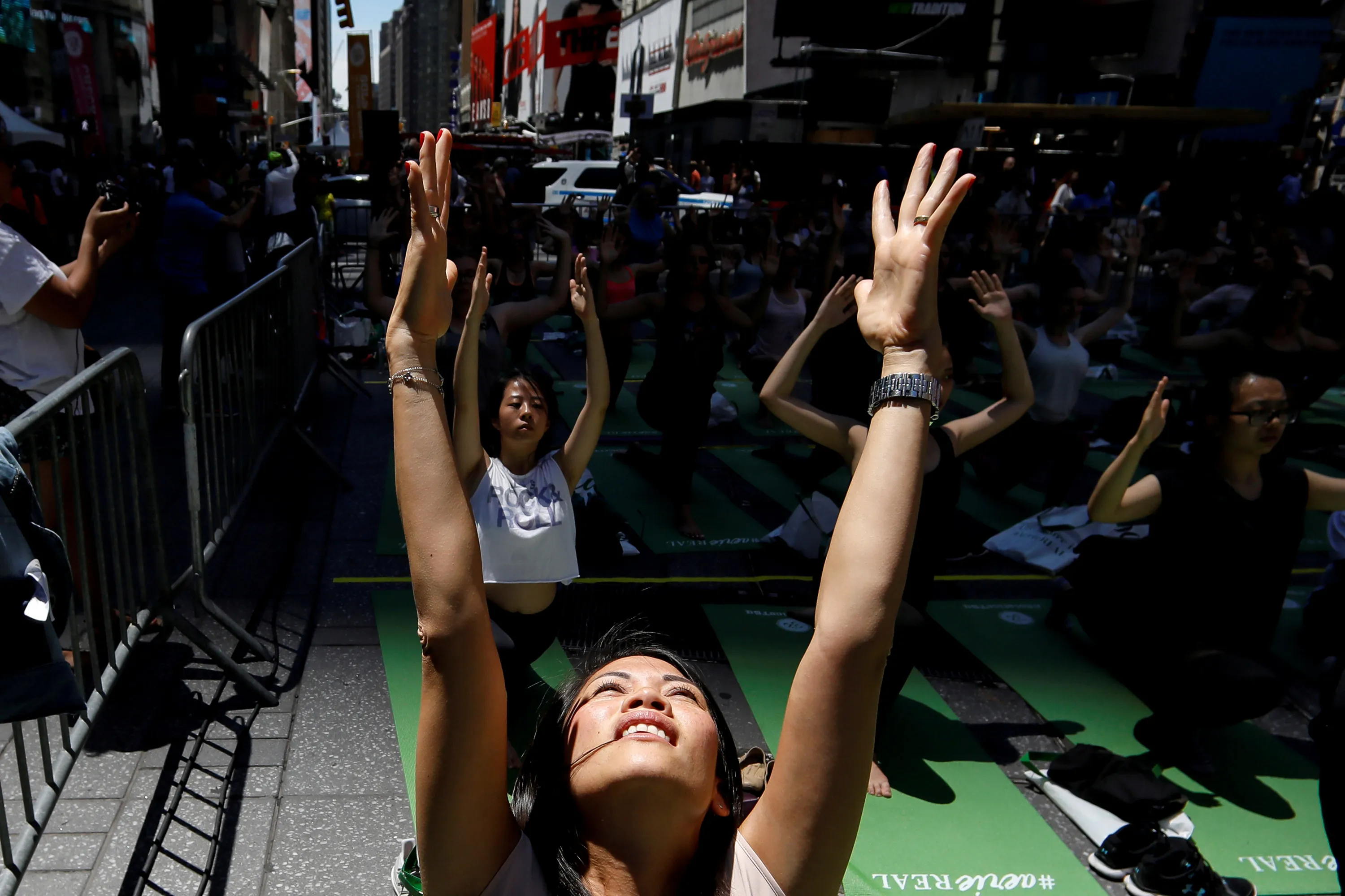 People participate in a yoga class during an annual Solstice event in the Times Square in New York City, U.S., June 21, 2018. (Photo by Brendan McDermid/Reuters)