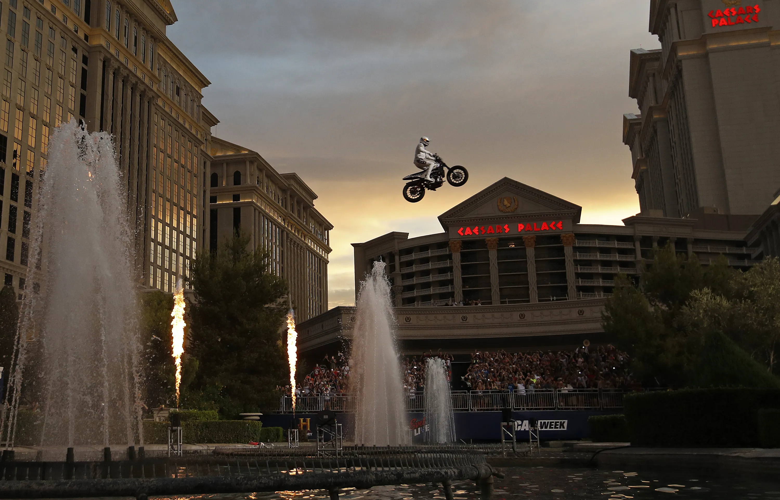Travis Pastrana jumps the fountain at Caesars Palace on a motorcycle Sunday, July 8, 2018, in Las Vegas. Pastrana recreated three of Evel Knievel's iconic motorcycle jumps on Sunday, including the leap over the fountains of Caesars Palace that left Knievel with multiple fractures and a severe concussion. (Photo by John Locher/AP Photo)