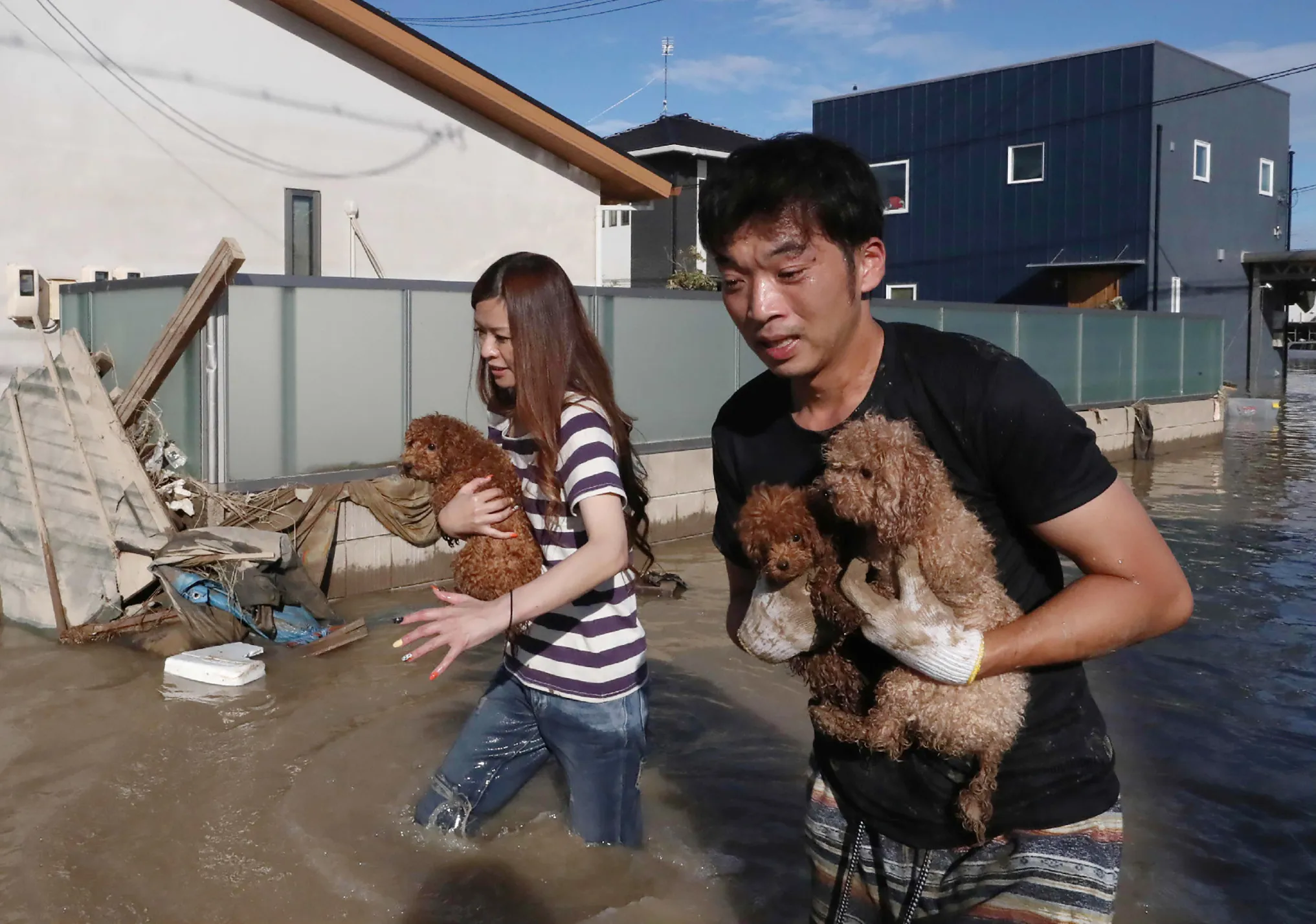 Residents rescue dogs from flooded area in Kurashiki, Okayama prefecture on July 8, 2018. The death toll from record rains that have devastated parts of Japan rose Sunday to at least 57, officials said, as rescue workers and troops struggled in the mud and water to save lives. (Photo by AFP Photo/JIJI Press/Stringer)