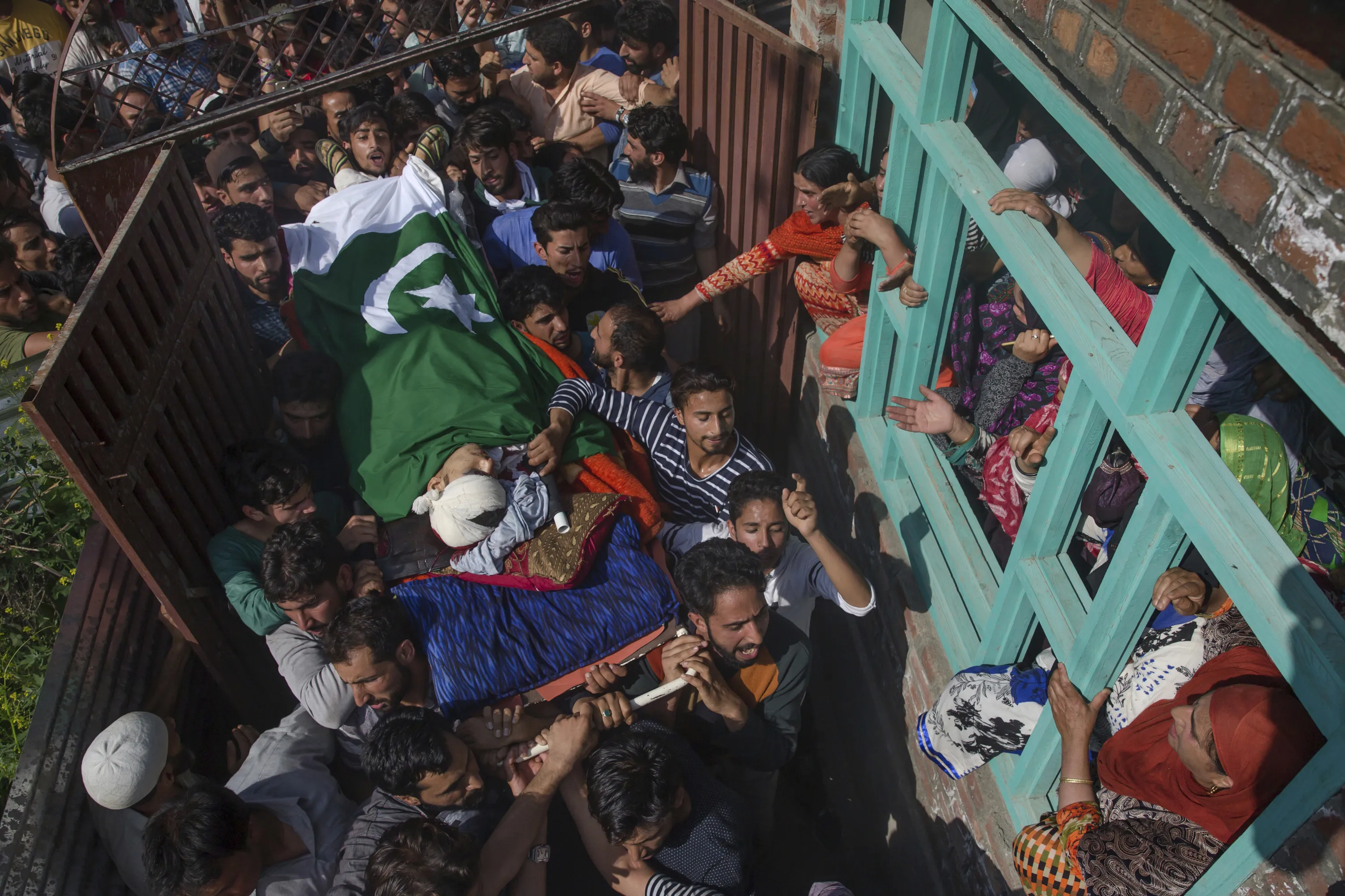 Kashmiri villagers carry the body of a teenage boy Tamsheel Ahmed Khan during his funeral procession in Vehil village, some 65 Kilometers south of Srinagar, Indian controlled Kashmir, Tuesday, July 10, 2018. Government forces fired at protesters Tuesday in Indian-controlled Kashmir, killing Khan and wounding at least 120 more who had been trying to reach the site of a gunbattle in which soldiers killed two rebels, police and residents said. (Photo by Dar Yasin/AP Photo)