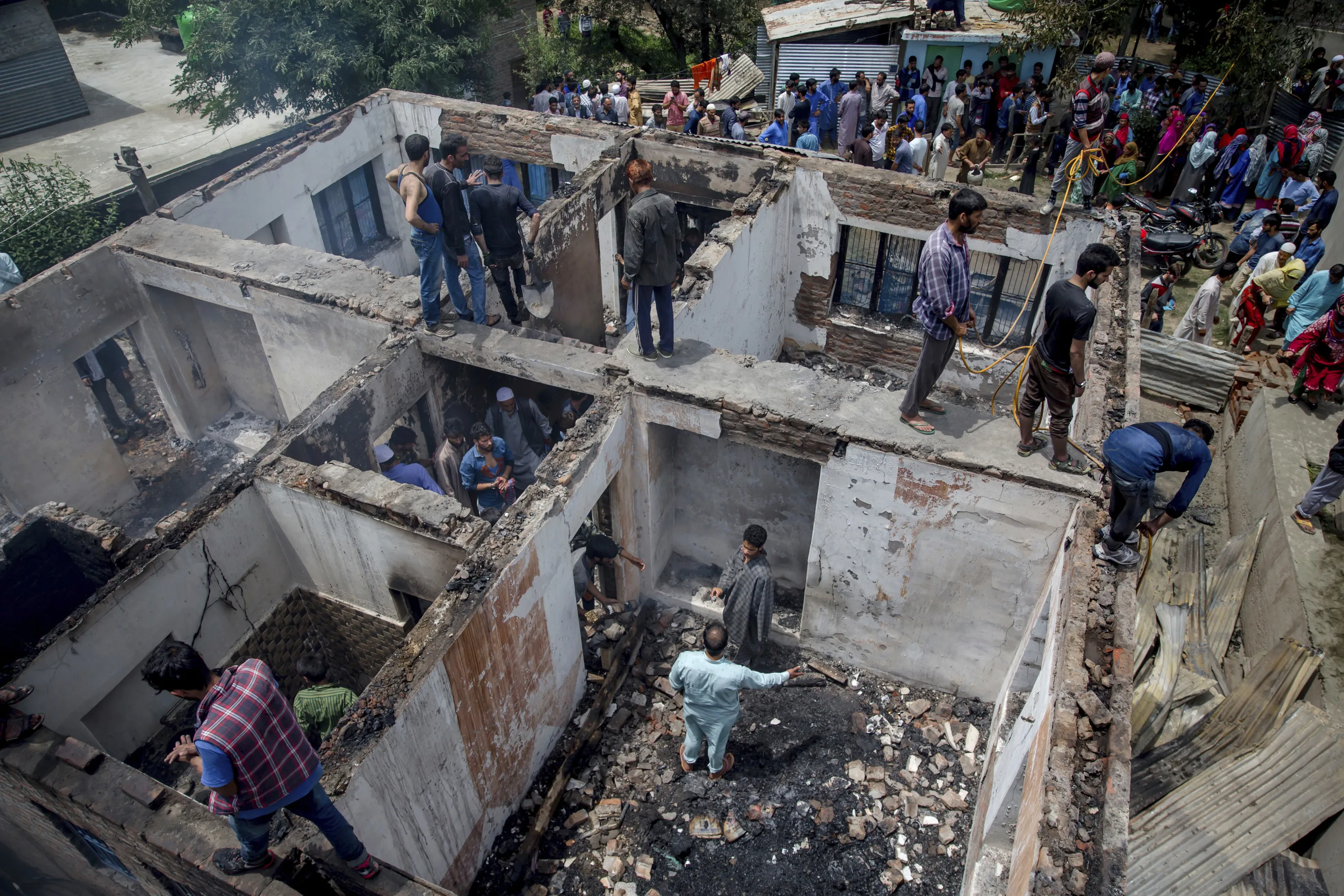 Kashmiri villagers inspect a house damaged during a gun battle between Indian soldiers and suspected militants in Kundalan village, some 60 Kilometers south of Srinagar, Indian controlled Kashmir, Tuesday, July, 10, 2018. Government forces fired at protesters Tuesday in Indian-controlled Kashmir, killing a teenager and wounding at least 120 more who had been trying to reach the site of a gunbattle in which soldiers killed two rebels, police and residents said. (Photo by Dar Yasin/AP Photo)