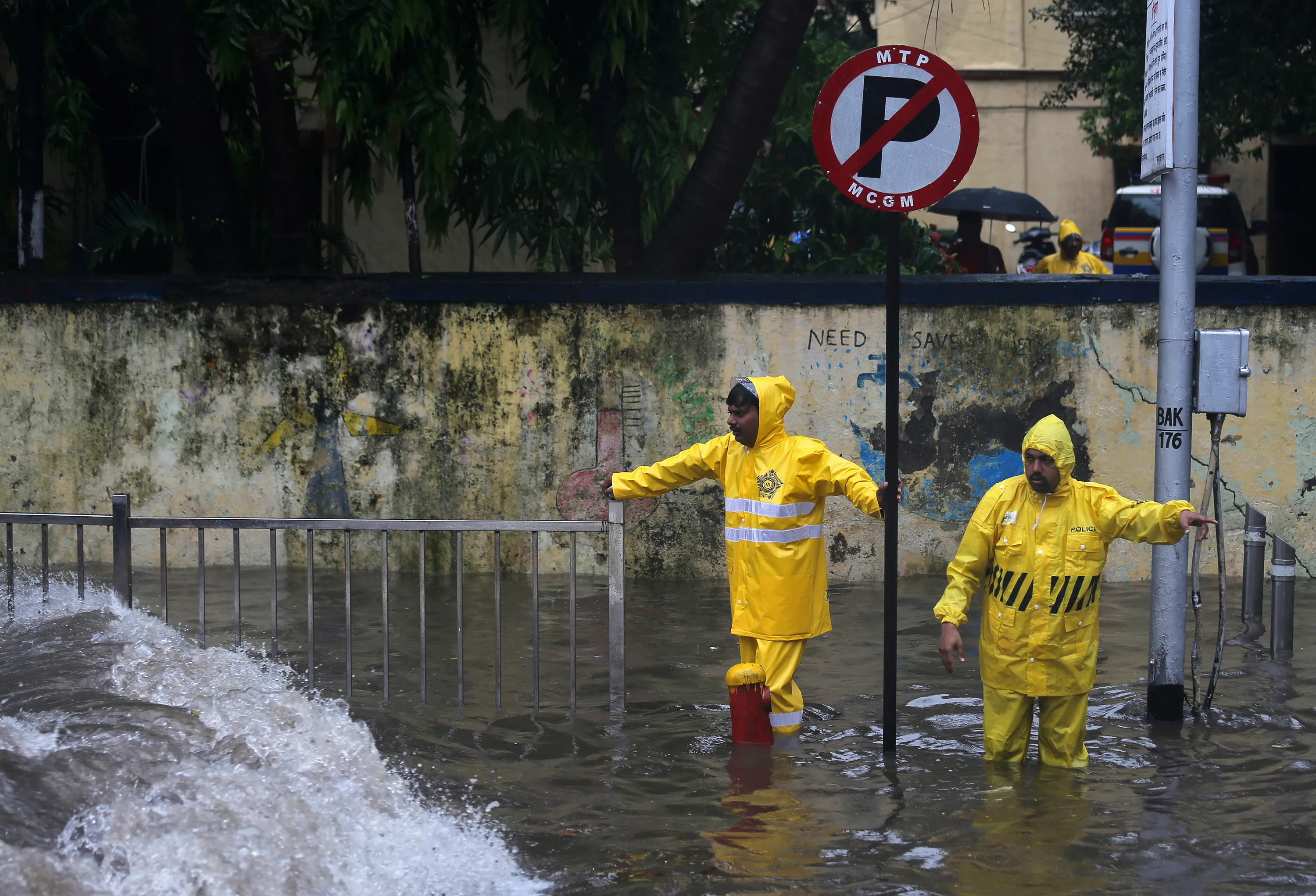 Policemen direct traffic at a waterlogged street after heavy rains in Mumbai, July 3, 2018. (Photo by Francis Mascarenhas/Reuters)