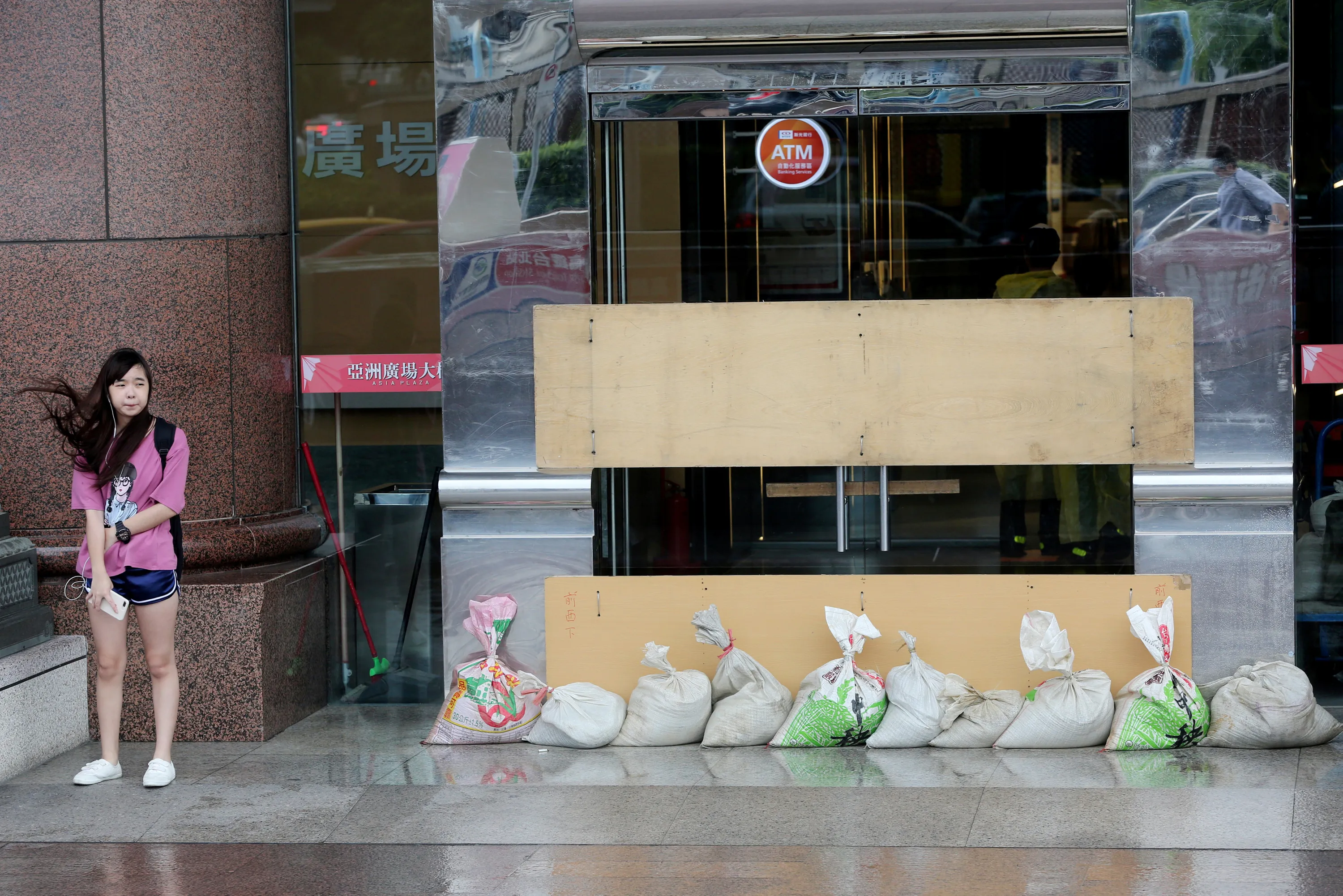 Sand bags to prevent flooding are placed at the entrance of a building in Taipei as Taiwan braced for super typhoon Maria on July 10, 2018. (Photo by Eason Lam/Reuters)