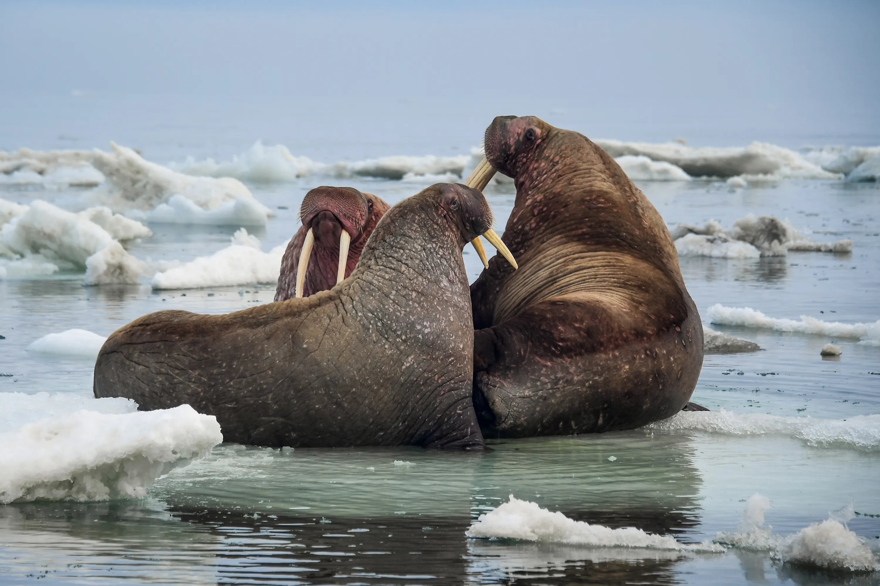 Pacific walruses on an ice floe by Cape Dezhnev, Chukotka, the easternmost mainland point of Russia on June 23, 2018. (Photo by Yuri Smityuk/TASS)