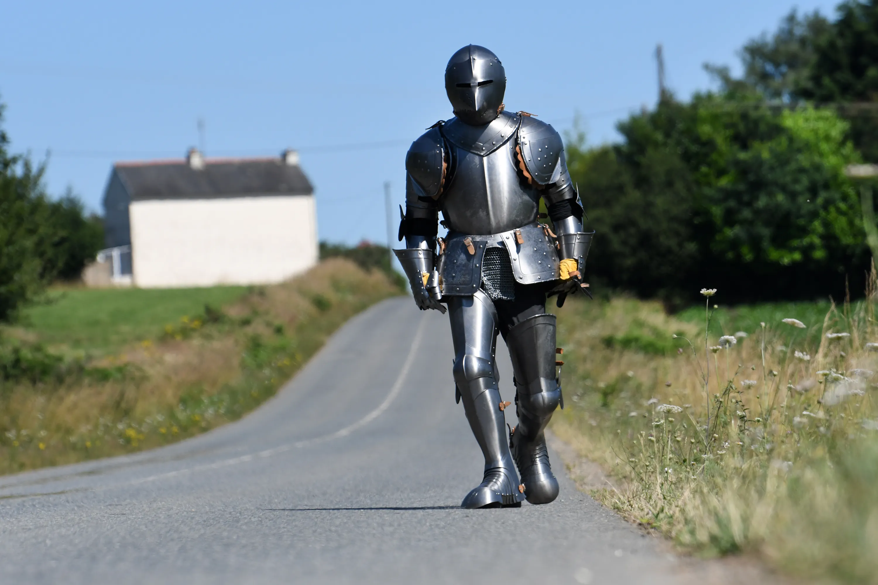 French artist and performer Abraham Poincheval wears a plate armour as he walks on July 9, 2018 in Carnoet, western France. For a few years Poincheval has broadened experiences of confinement such as staying in a statue of man-lion for a week in the museum park of Aurignac, or spending 8 days in a hole under a one-tonne stone and 2 weeks inside a stuffed bear. He now plans to walk 170 kilometers across French Brittany wearing a plate armour like an “erring knight” of the XXI century. (Photo by Fred Tanneau/AFP Photo)