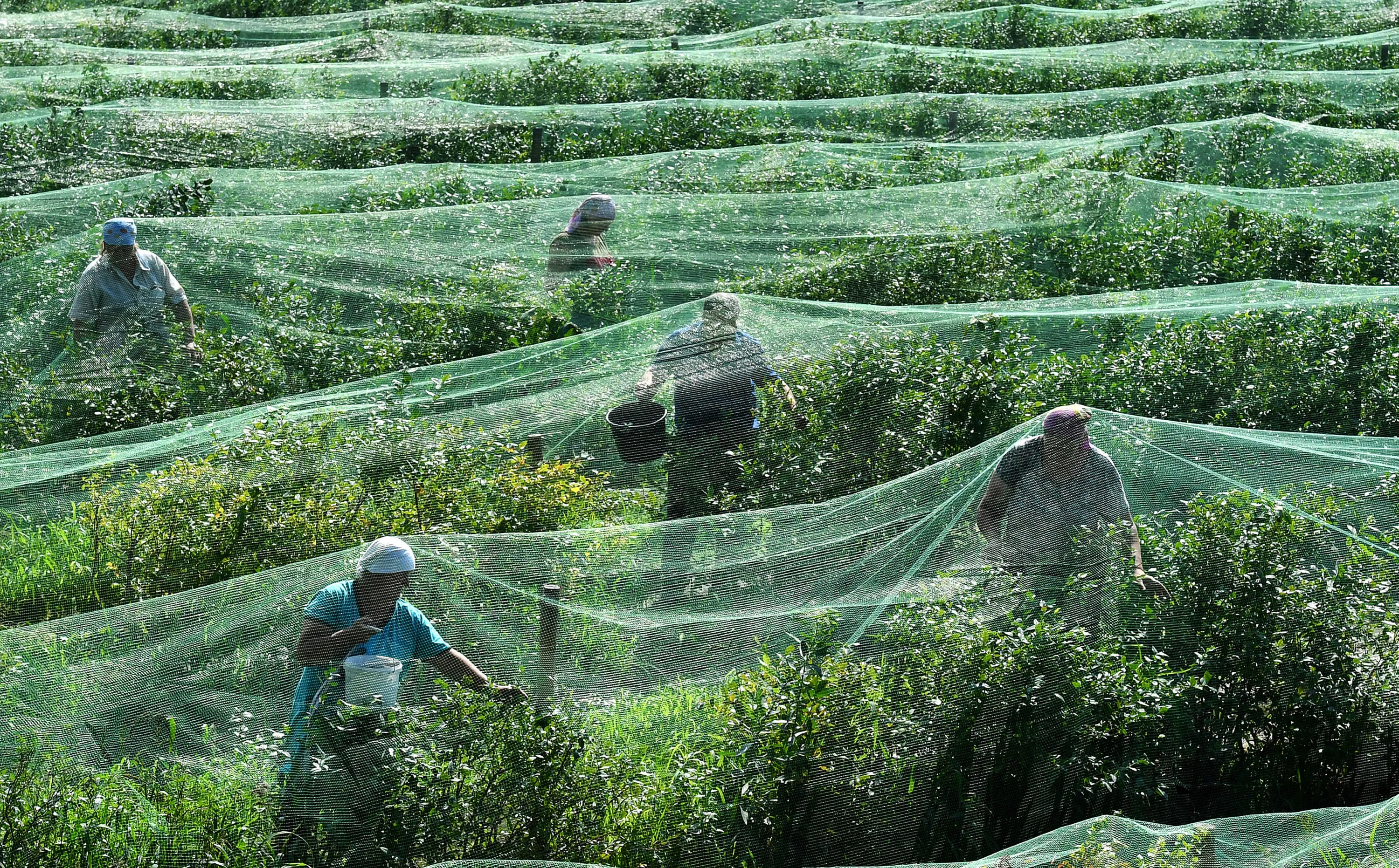 Workers harvest bog blueberry at the Olshany farm near the village of Vysokoye, Brest Region, Belarus on July 12, 2018. (Photo by Viktor Drachev/TASS)