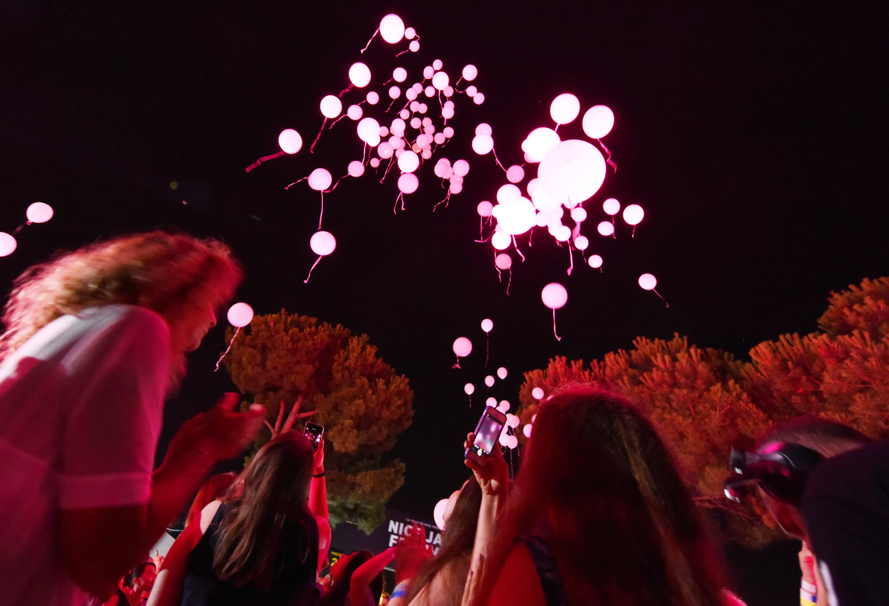 People take pictures of ballons that were released into the sky to pay tribute to the victims of the truck attack along the Promenade des Anglais that killed 86 people two years ago on Bastille Day, in Nice, France, July 14, 2018. (Photo by Jean-Pierre Amet/Reuters)