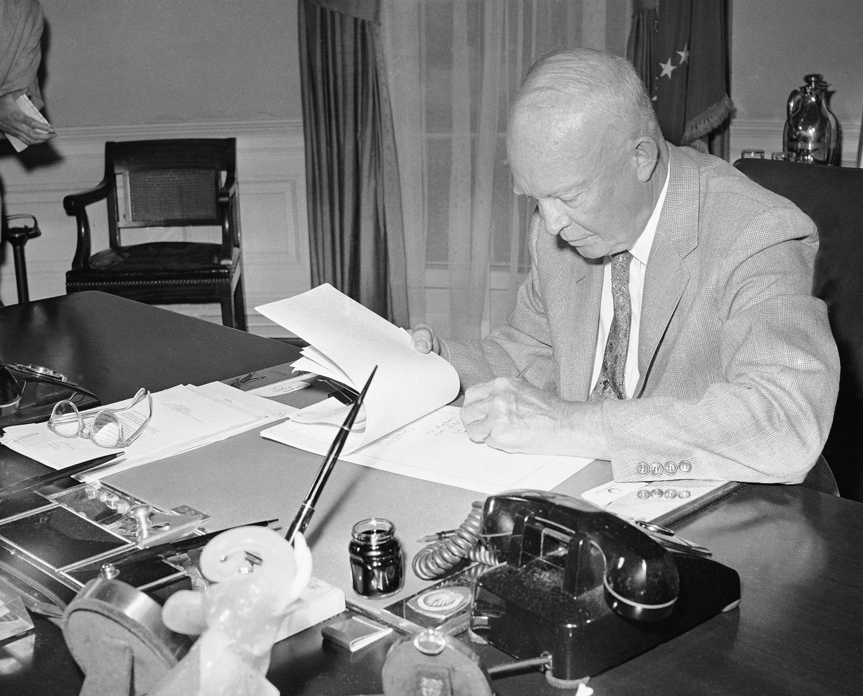 President Dwight D. Eisenhower signs the Alaska statehood bill, July 7, 1958, in Washington. This paves the way for the territory's admission to the Union later this year. (Photo by Charles Gorry/AP Photo)