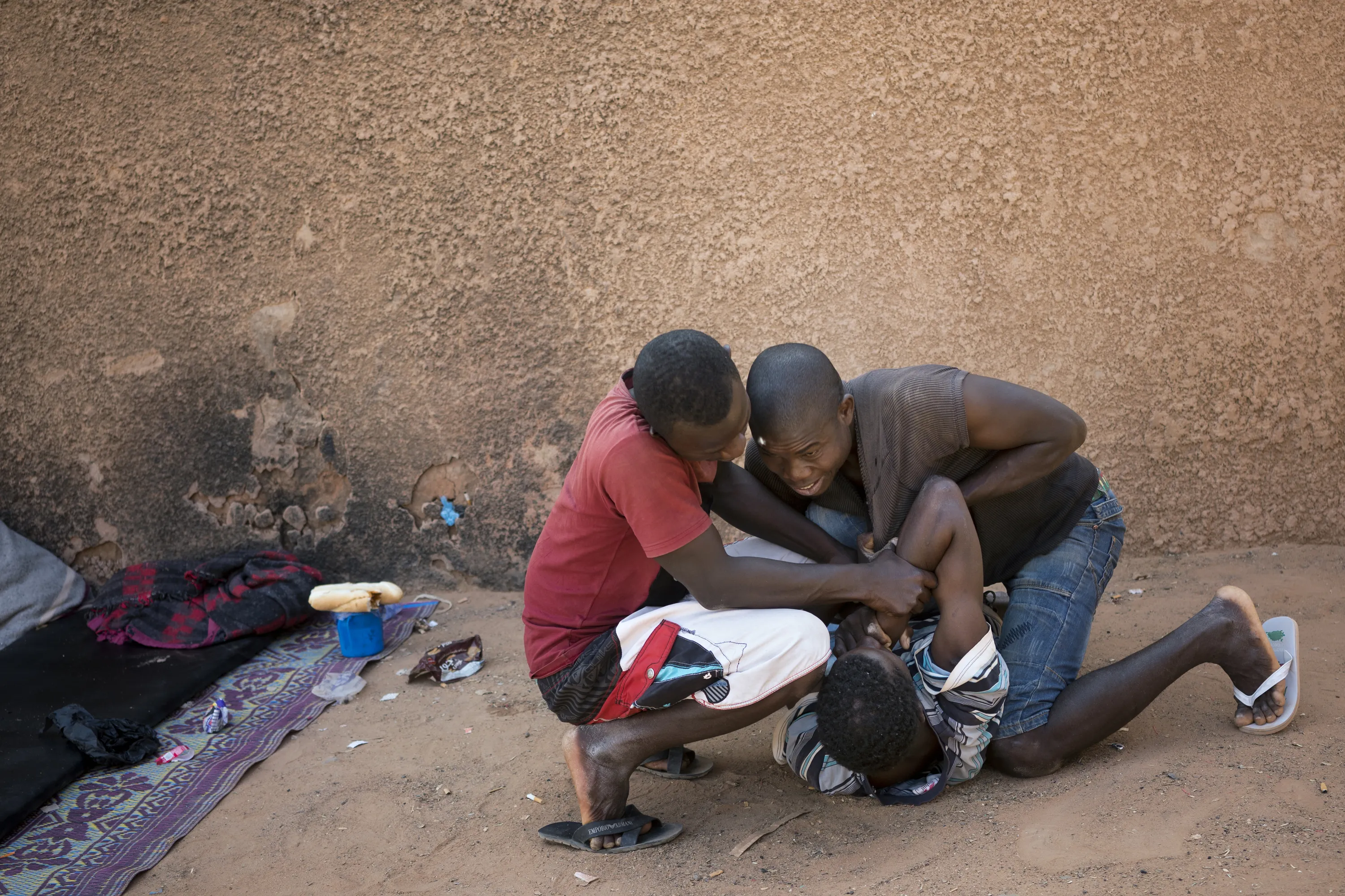 A migrant who was expelled from Algeria is restrained by others after he attempted to undress in the midst of a transit center in Arlit, Niger on Saturday, June 2, 2018. Gently and firmly, he was restrained and his trousers belted. They had spent the previous evening bathing him. (Photo by Jerome Delay/AP Photo)