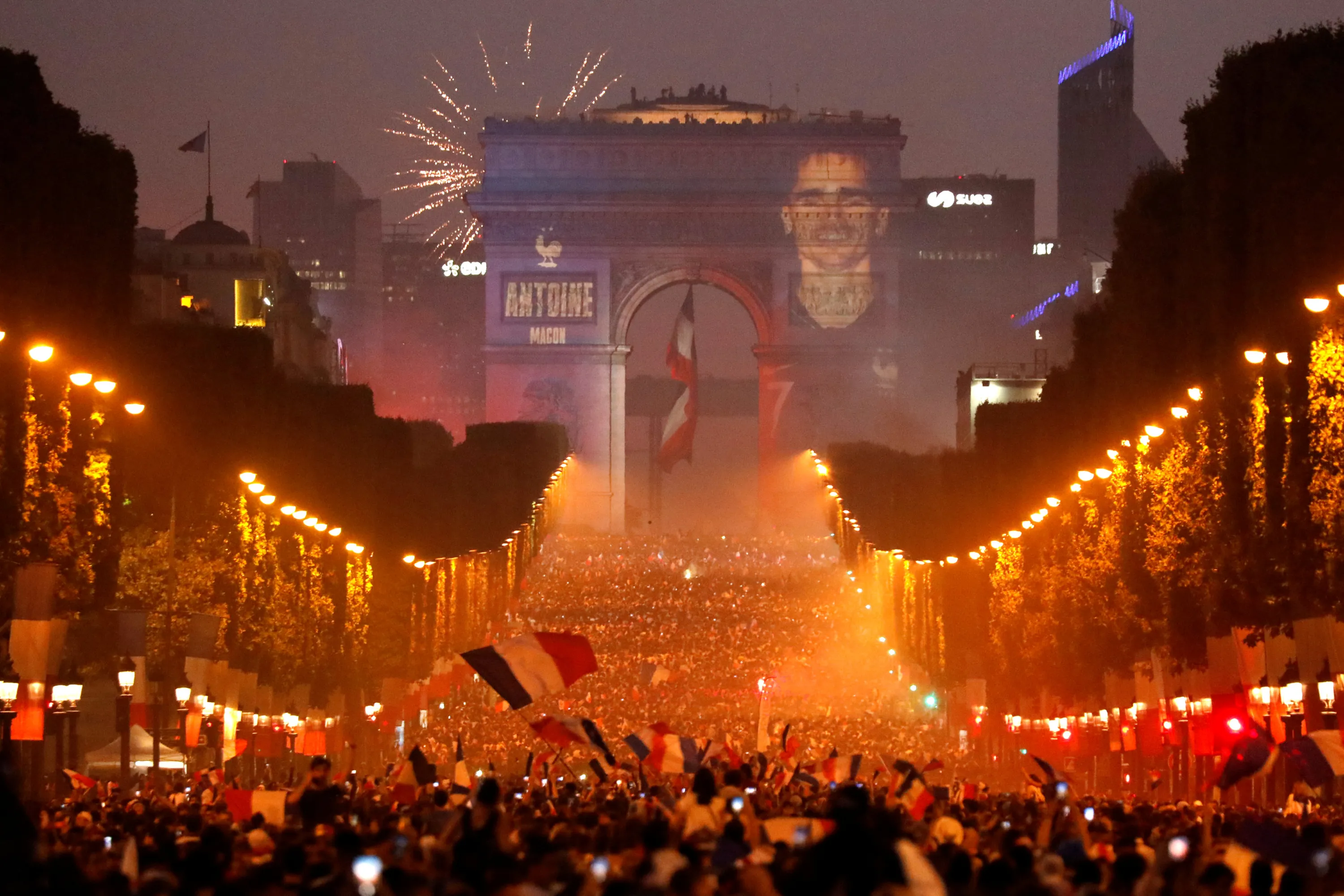 A giant picture of France's Antoine Griezmann is seen on the Arc de Triomphe in Paris, France on July 15, 2018, as France fans celebrate on the Champs-Elysees Avenue after France won the Soccer World Cup final. (Photo by Charles Platiau/Reuters)