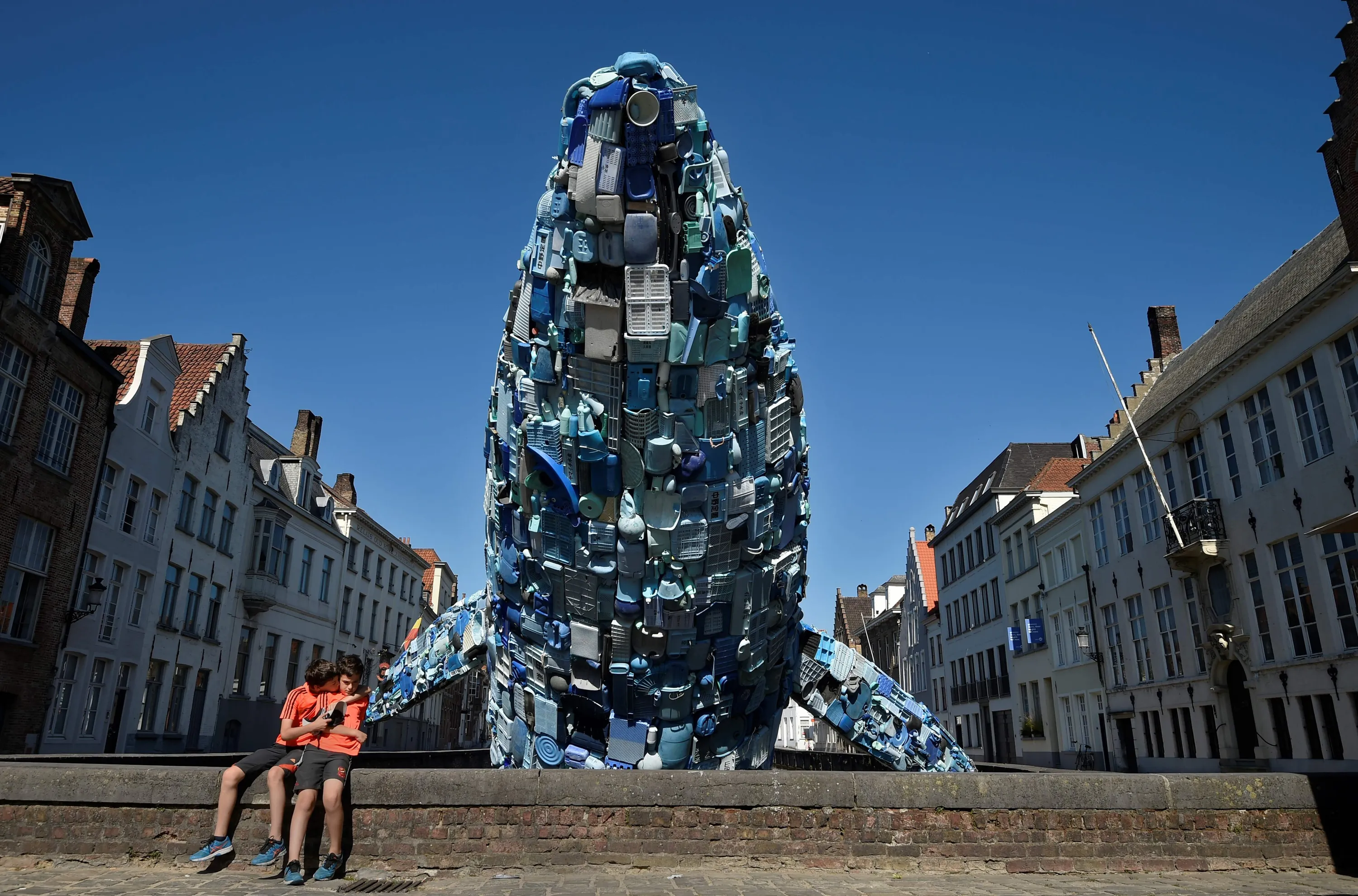 A 12-metre installation depicting a whale, made up of five tons of plastic waste pulled out of the Pacific Ocean, is displayed in Brugges, on July 14, 2018 for the 2018 Bruges Triennial. (Photo by John Thys/AFP Photo)