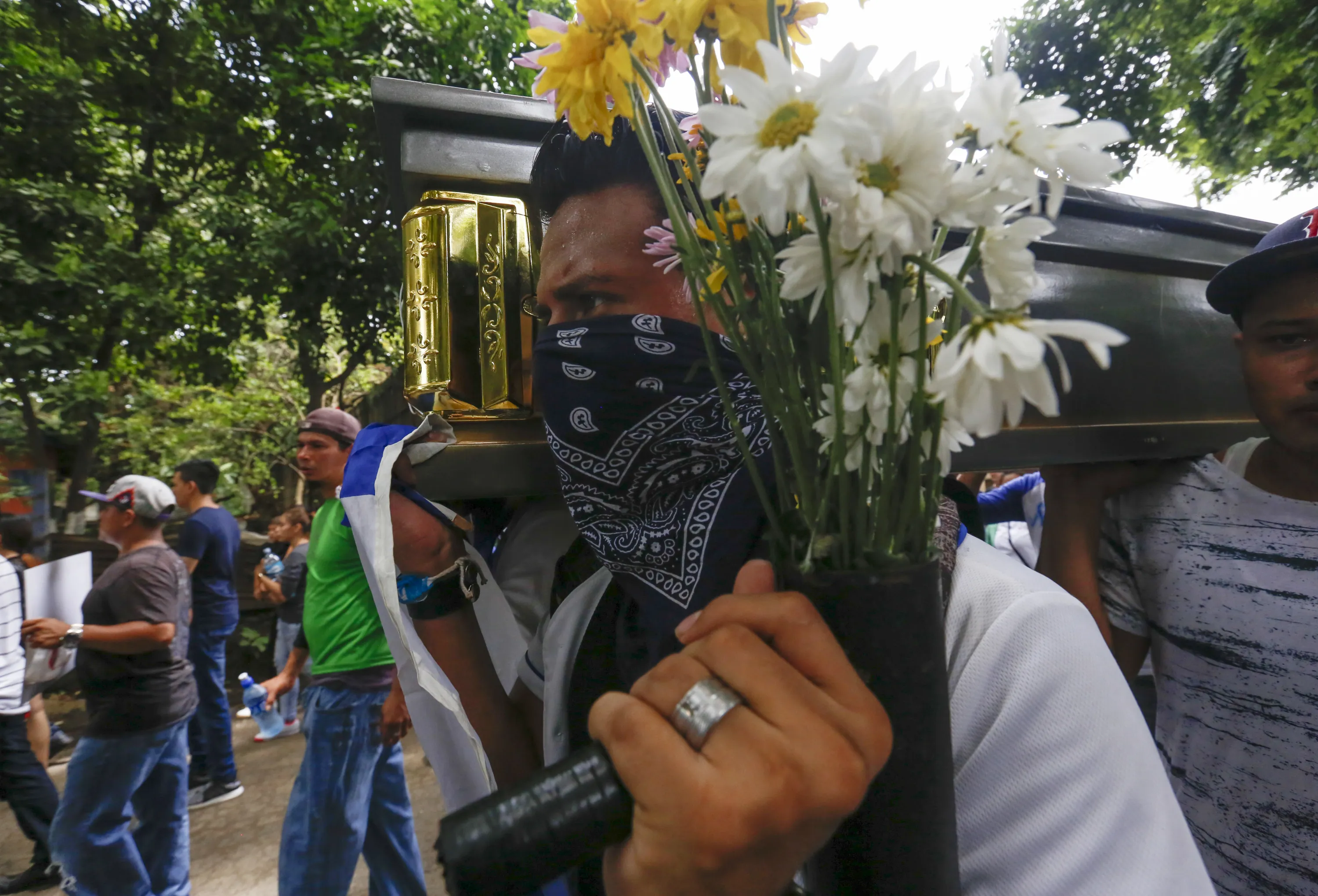 Friends and family carry the coffin with the body of Gerald Vasquez, an engineering student that was killed during the July 14 attack by police and paramilitary forces to the National University of Managua, to be buried in Managua, Nicaragua, Monday, July 16, 2018. The onslaught was televised by local media outlets and covered by three local journalists who reported via Facebook Live. Students fearing for their lives sent farewell messages to friends and family. “I did it for the country and I don't regret it”, a crying girl said in a video that went viral. “Forgive me mama, I love you”. (Photo by Alfredo Zuniga/AP Photo)