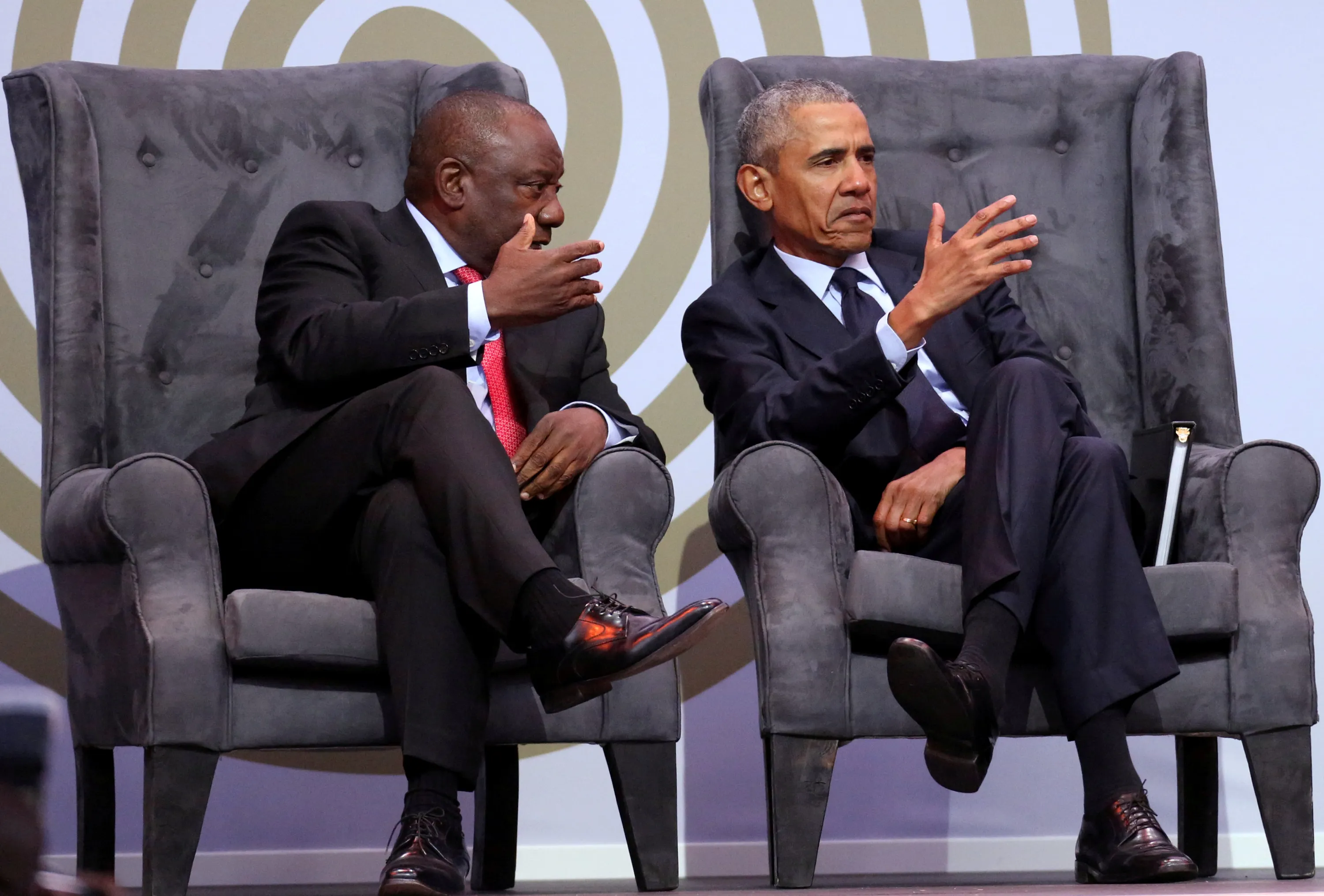 South African President Cyril Ramaphosa talks to former U.S. President Barack Obama at the 16th Nelson Mandela annual lecture, marking the centenary of the anti-apartheid leader's birth, in Johannesburg, South Africa July 17, 2018. (Photo by Siphiwe Sibeko/Reuters)
