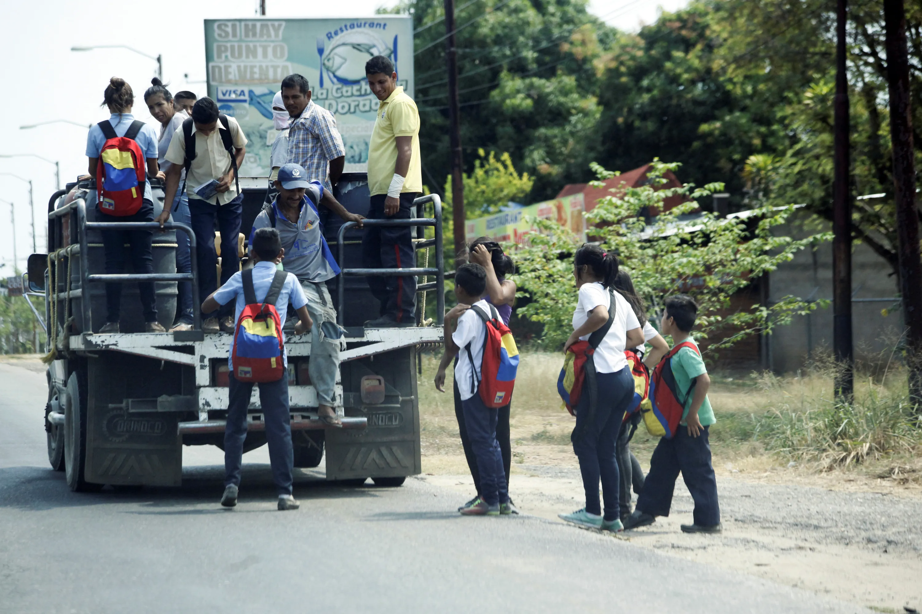 School children get on the back of a truck on their way to school in Socopo, Venezuela on April 25, 2018. In Socopo, in the agricultural savannah state of Barinas that was once home to Chavez, half of the 20 public schools, including Orlando Garcia, closed completely in February, mid-term. They have since reopened, but, along with the rest of Barinas' approximately 1,600 public schools, they are operating just three days a week. (Photo by Carlos Eduardo Ramirez/Reuters)