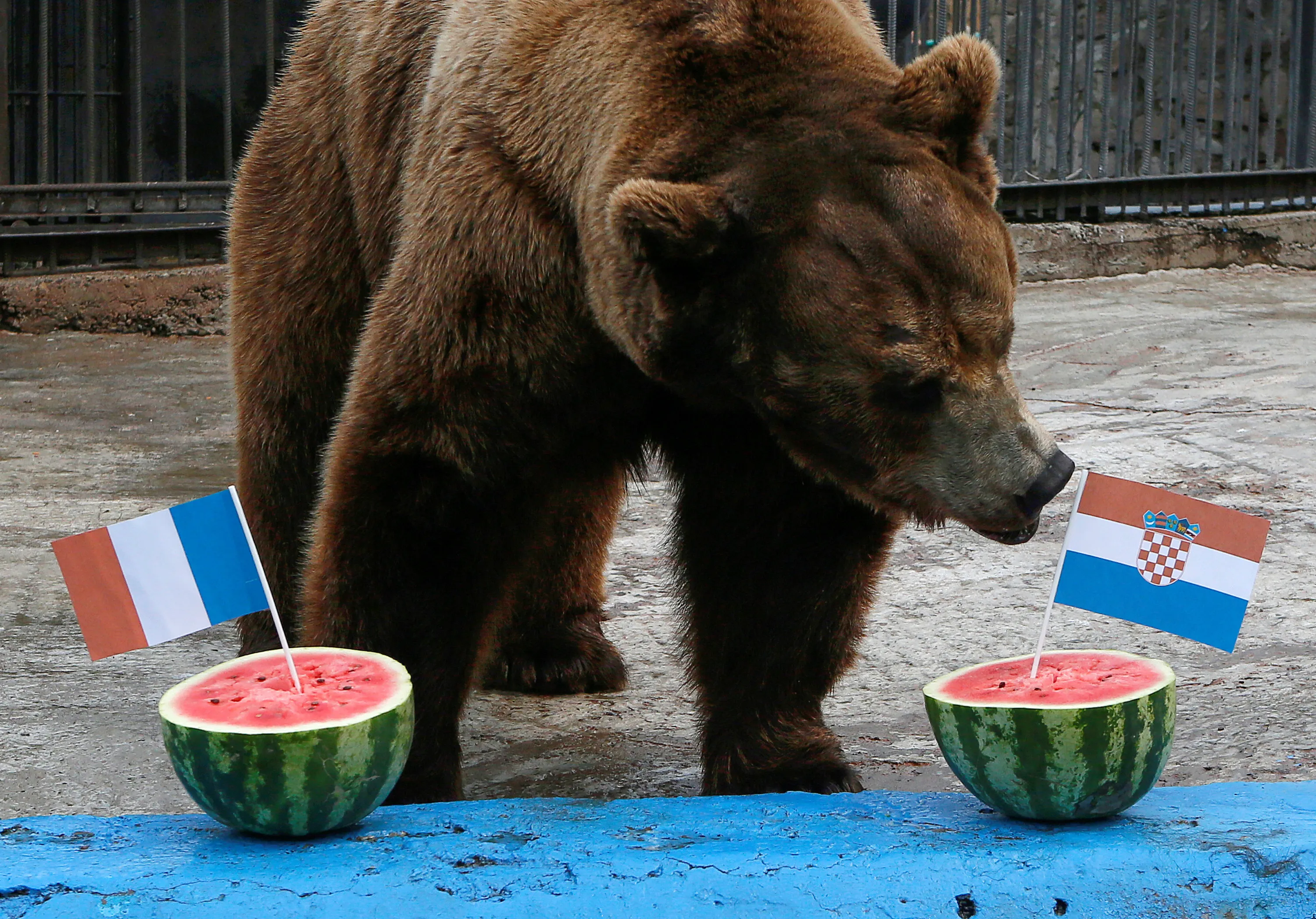 Buyan, a male Siberian brown bear, attempts to predict the result of the soccer World Cup final match between France and Croatia during an event at the Royev Ruchey Zoo in Krasnoyarsk, Russia July 14, 2018. (Photo by Ilya Naymushin/Reuters)