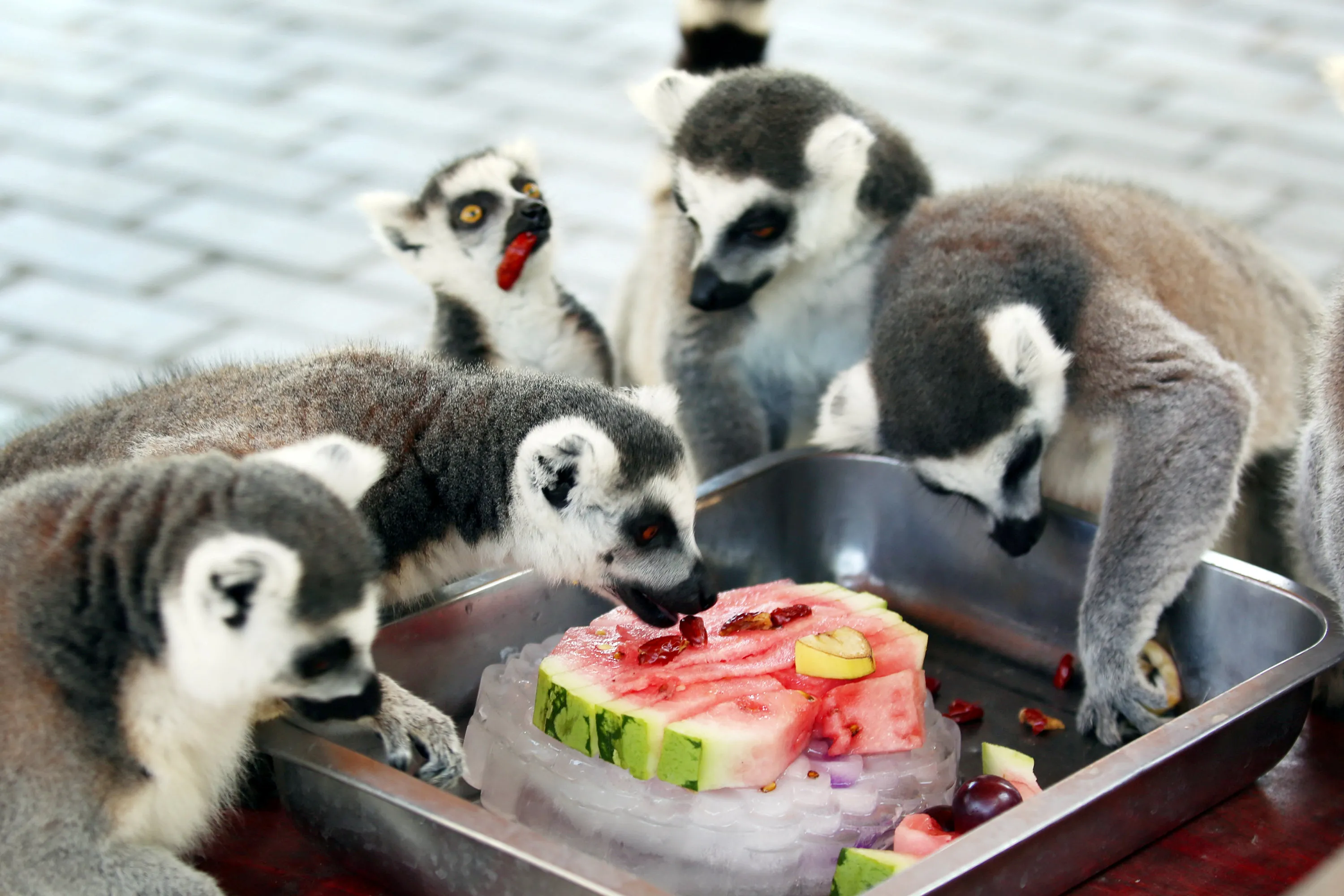 Ring-tailed lemurs eat a slice of watermelon on ice during the hot weather in a zoo in Changzhou, Jiangsu province, China July 18, 2018. (Photo by Reuters/China Stringer Network)
