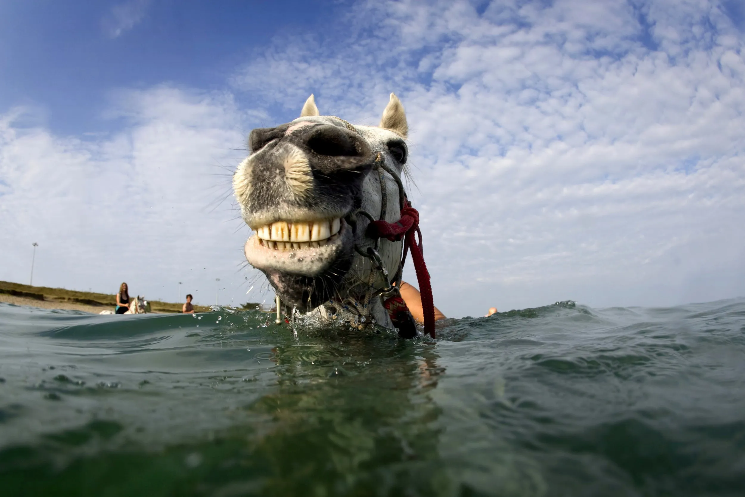 A horse smiles for the camera, swimming off the Mount's Bay, Cornwall on July 14, 2018. Cornwall Swimming Horses offer unique horse riding experiences in which you can swim with horses. (Photo by Cornwalllive/South West News Service)