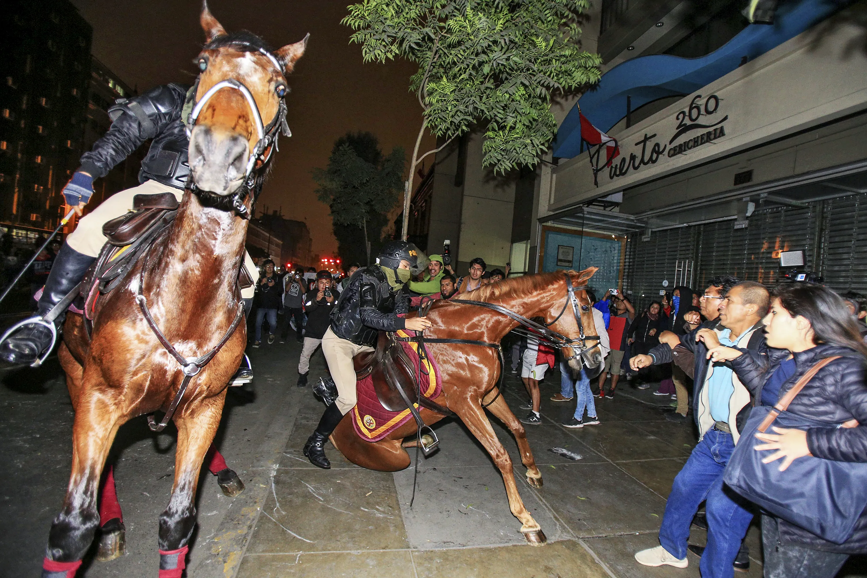 A police horse falls to the ground during the “Great March For a Total Reform of the Political and Judicial System”, in Lima, Peru, 19 July 2018. The march was organized in response to recently disclosed corruption cases allegedly involving judges and members of the National Magistracy Council. (Photo by German Falcon/EPA/EFE)