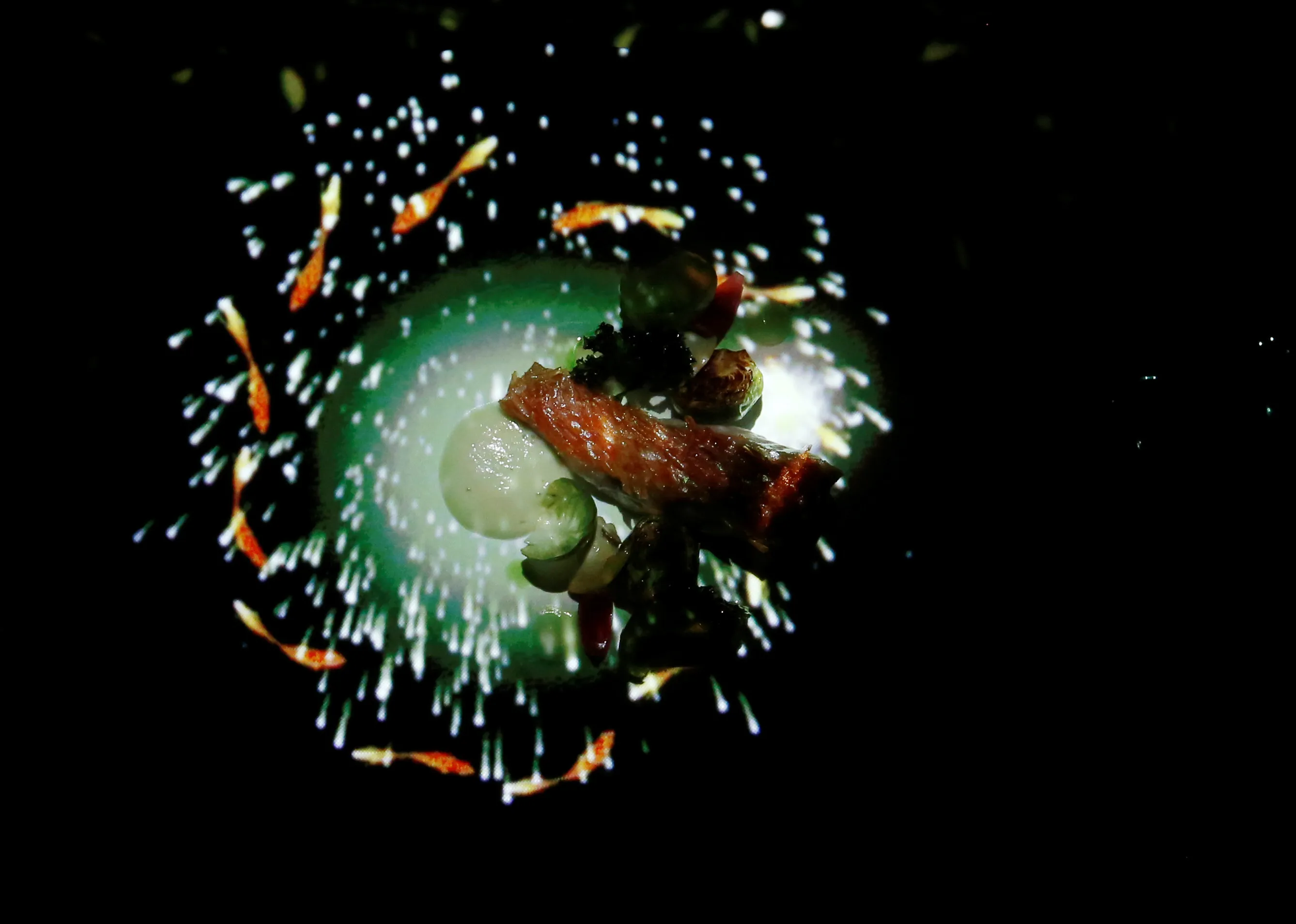 The projection mapping is cast on a plate during its media preview at “TREE BY NAKED, yoyogi park” restaurant in Tokyo, Japan, July 19, 2018. (Photo by Kim Kyung-Hoon/Reuters)