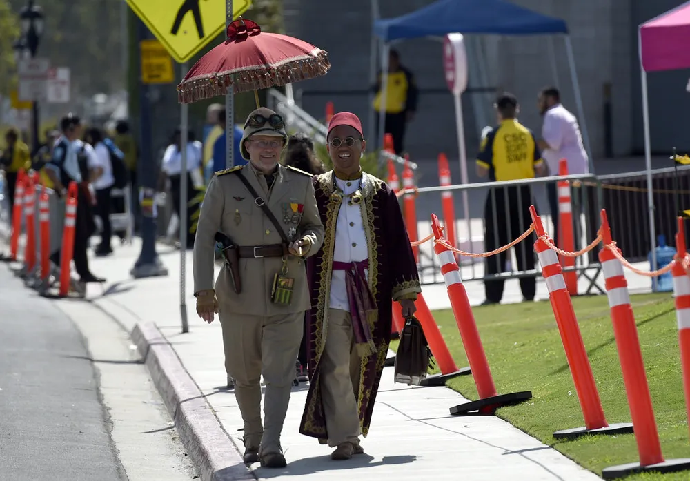 Tony Quirk, left, and Daniel Fernandez, of San Diego, attend day one of Comic-Con International on Thursday, July 19, 2018, in San Diego.(Photo by Chris Pizzello/Invision/AP Photo)