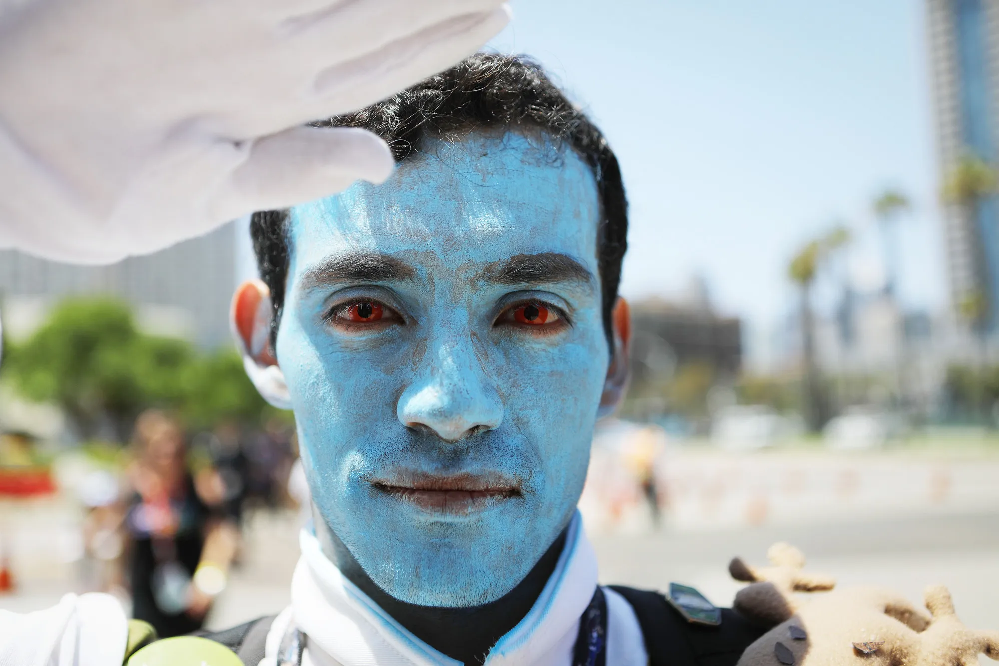 A costumed reveler poses outside San Diego Comic-Con on July 19, 2018 in San Diego, California. Thousands of comic book fans are arriving for the festivities at the annual comic and entertainment convention. (Photo by Mario Tama/Getty Images)