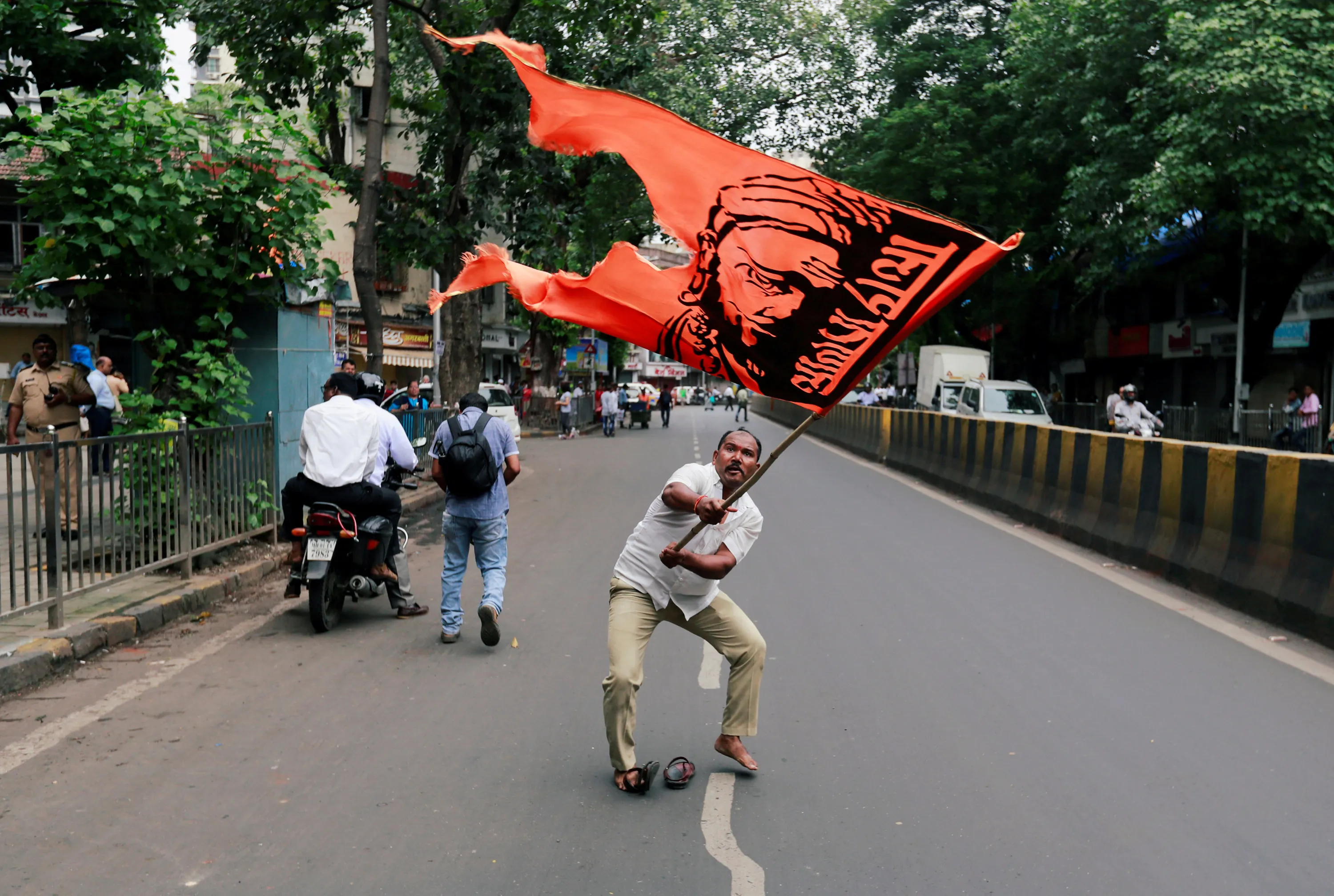 A man waves a flag as he blocks a road during a protest, organised by Maharashtra state's Maratha community, to press their demands for reserved quotas in government jobs and college places for students in Mumbai, India July 25, 2018. (Photo by Danish Siddiqui/Reuters)