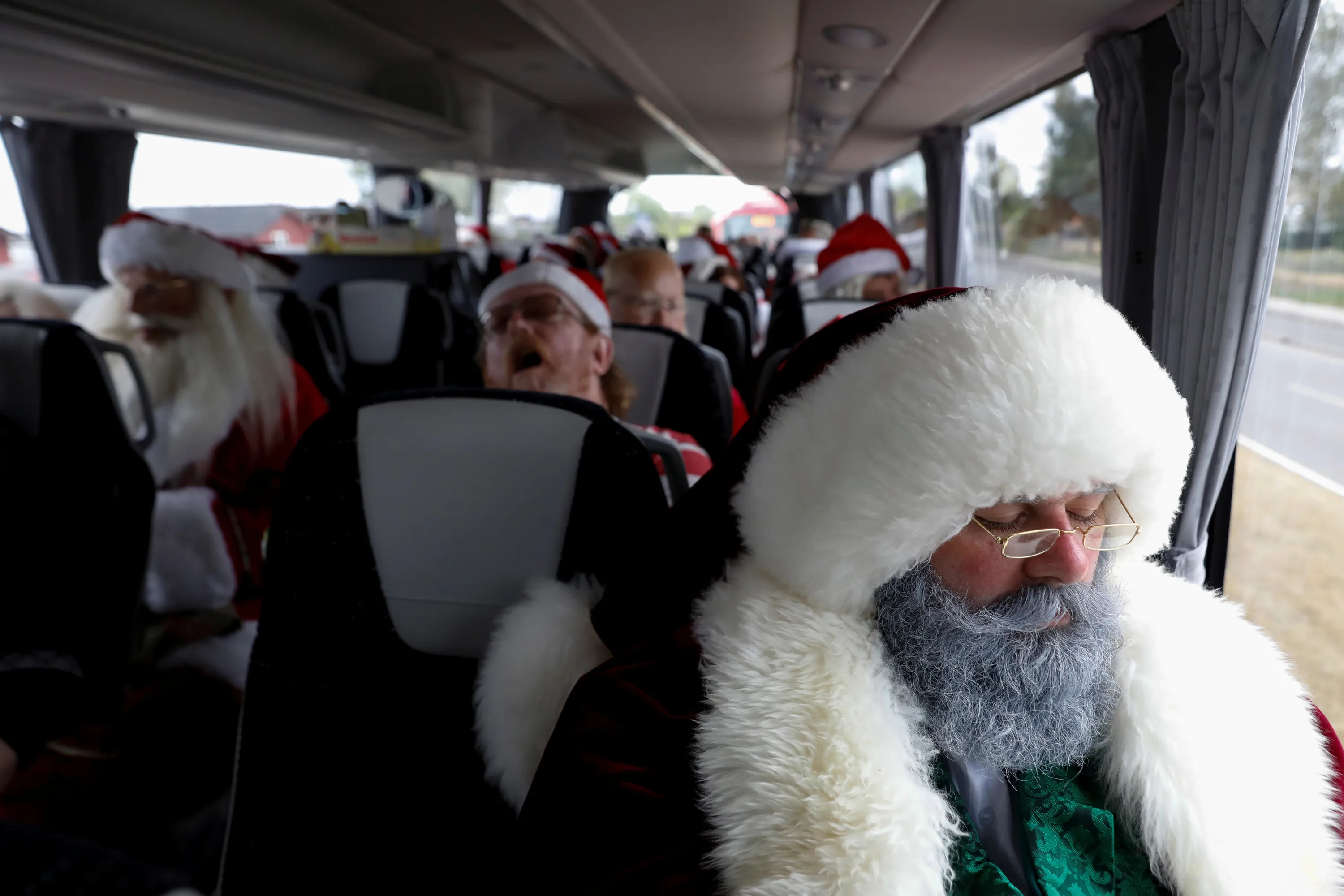 People dressed as Santa Claus rest while on a bus trip between events during the World Santa Claus Congress, an annual event held every summer in Copenhagen, Denmark, July 23, 2018. (Photo by Andrew Kelly/Reuters)