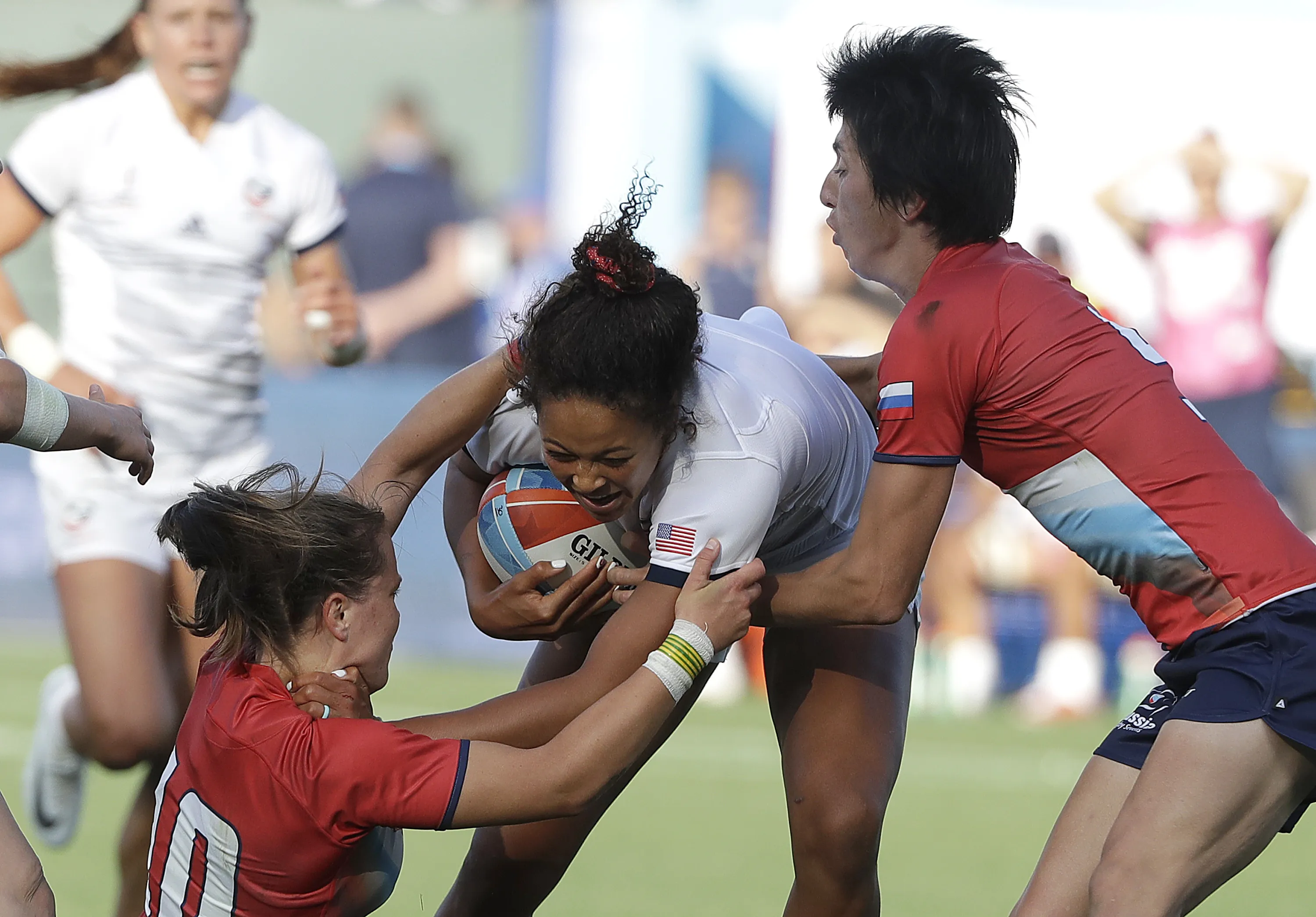 United States's Jordan Gray, center, runs against Russia during the Women's Rugby Sevens World Cup in San Francisco, Friday, July 20, 2018. (Photo by Jeff Chiu/AP Photo)