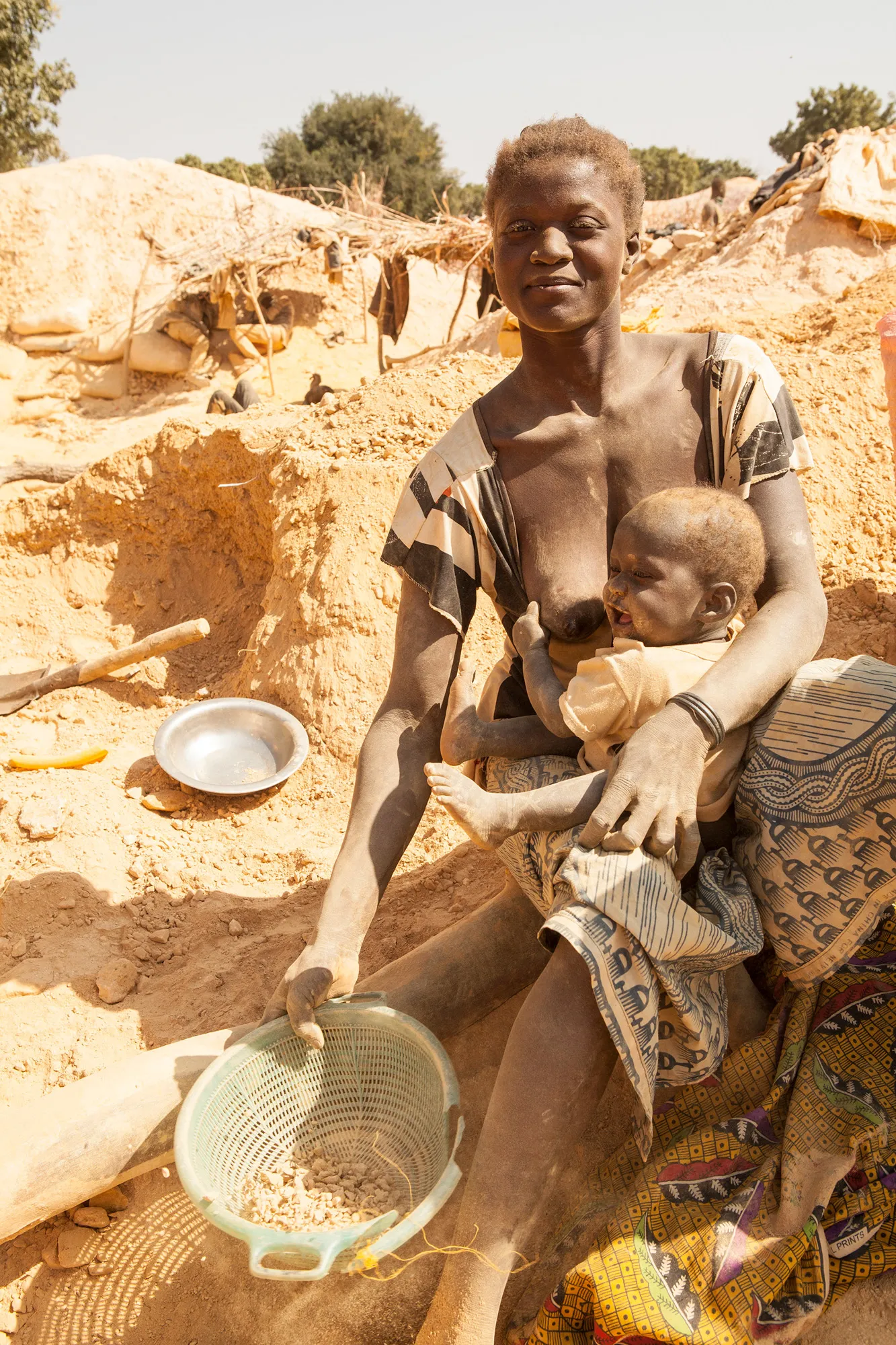 Burkina Faso, West Africa 2010. A woman and her newborn son process freshly recovered ore in the goldfields of West Africa’s Burkina Faso. Work in the mines is long and hard with little differentiation between the sexes other than that the men do the mining and many women help with the processing. (Photo by Hugh Brown/South West News Service)