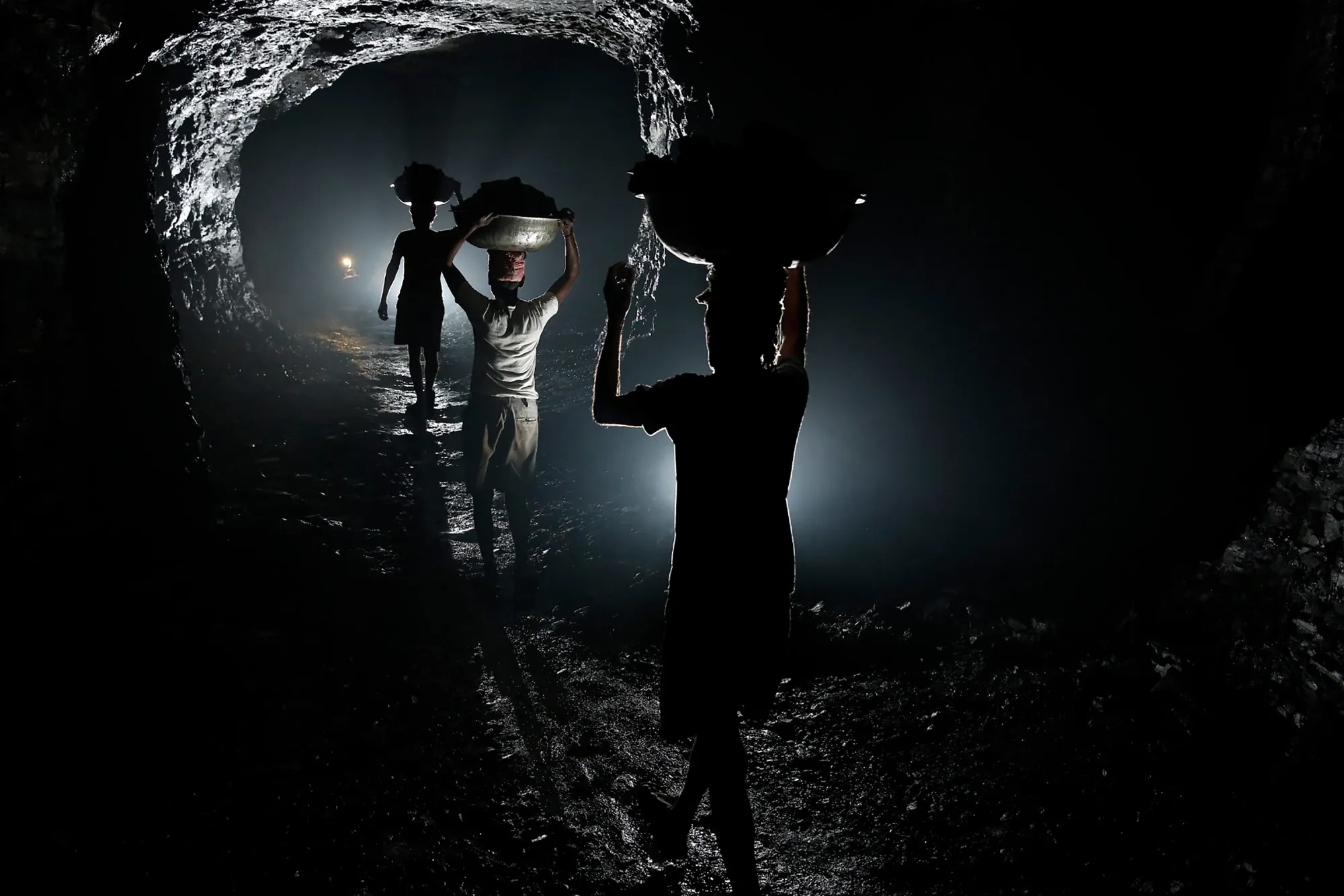 Bojharis carry coal chiselled out by coal cutters in an illegal underground coal mine in Eastern India. Average loads carried by these bojharis was around about 40 kilograms at a time. In this mine the miners had sought the input of a mining enginner to choose the placement of pillars within the mine and so minimise the risk of collapses. Eastern India, 2013. (Photo by Hugh Brown/South West News Service)