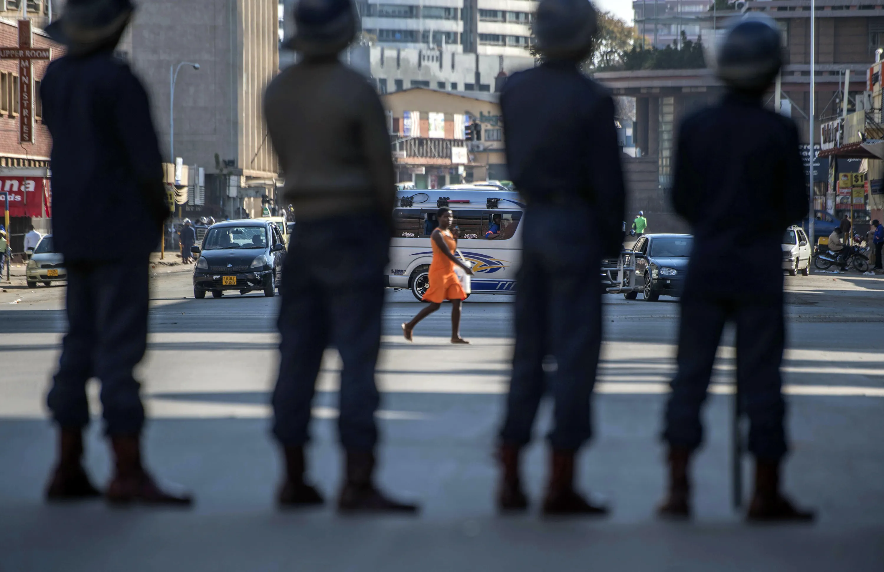 A pedestrian crosses a road in front of a police cordon in Harare, Zimbabwe, Thursday, August 2 2018. Gunfire, tear gas, and burning cars disrupted Harare's streets Wednesday as armed riot police and army troops clashed with rock-throwing opposition supporters after the Electoral Commission announced it would not give the results in July 30 2018 presidential elections today. (Photo by Mujahid Safodien/AP Photo)