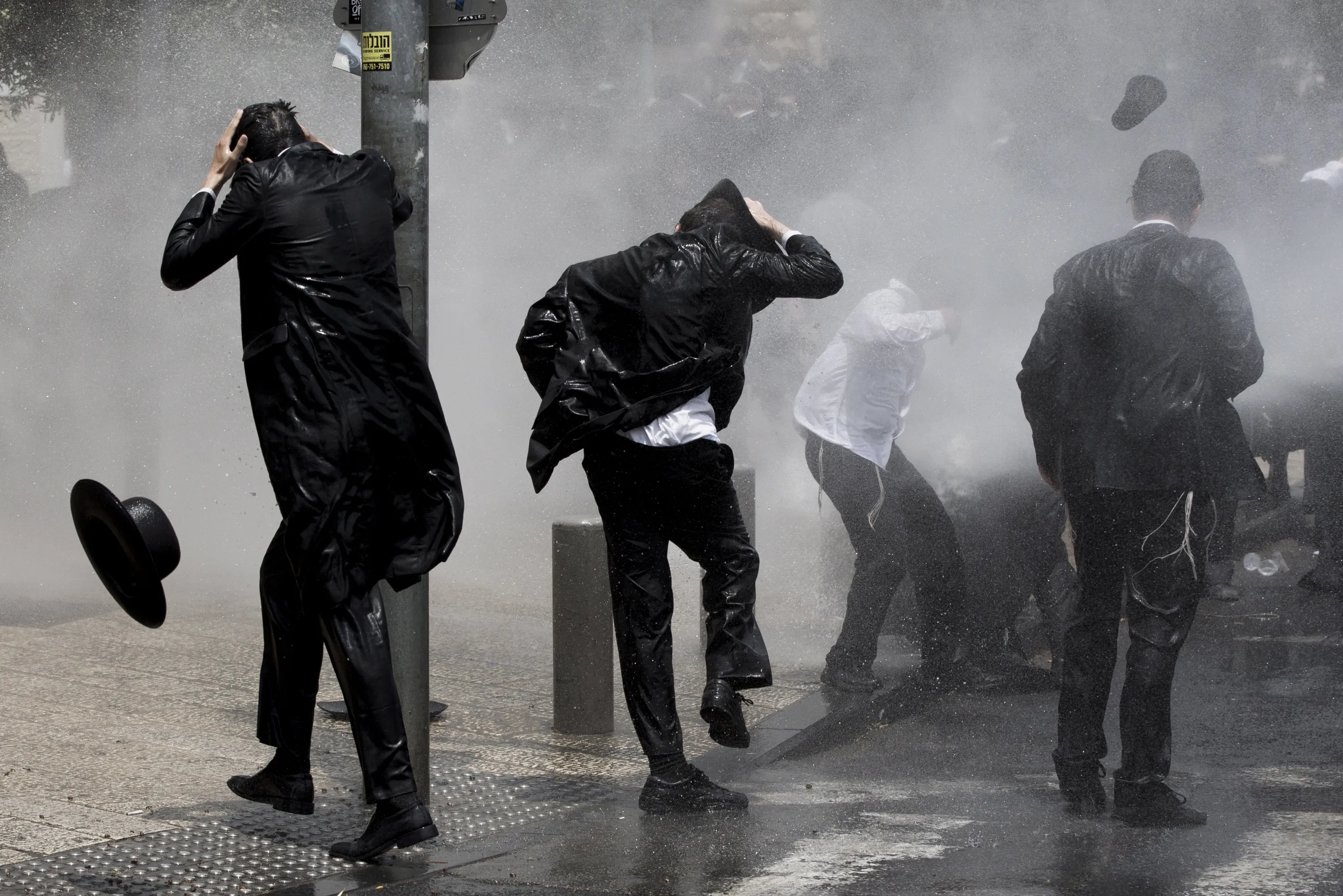 Police use water canon to disperse an Ultra-Orthodox Jewish demonstrators that block the Light Rail track during a protest against army recruitment in central Jerusalem, Israel, 02 August 2018. The Ultra-Orthodox community in Israel is holding ongoing protests against army recruitment. (Photo by Abir Sultan/EPA/EFE)