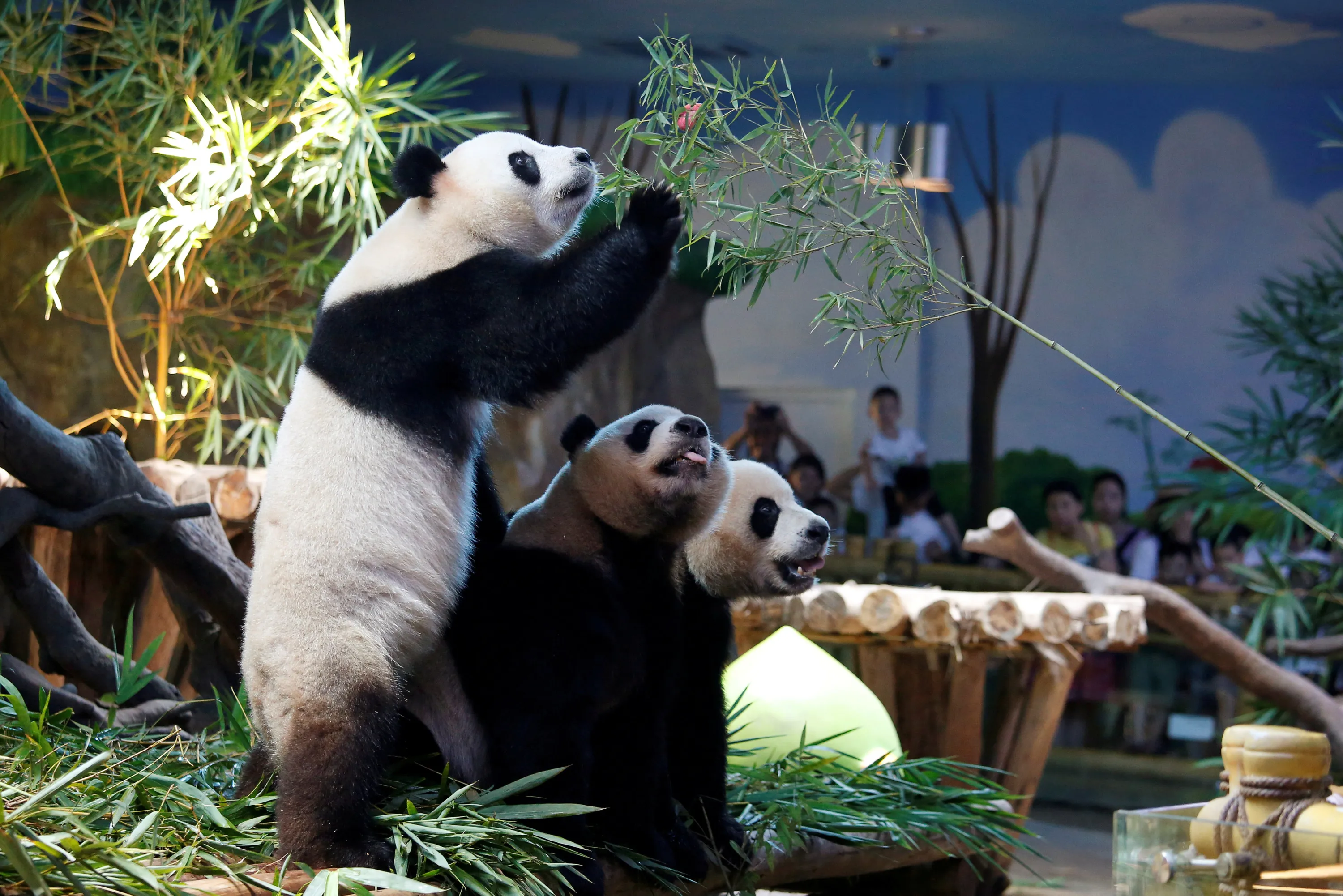 The world's only giant panda triplets Meng Meng, Shuai Shuai and Ku Ku celebrate their fourth birthday at Chimelong Safari Park in Guangzhou, China July 29, 2018. (Photo by Bobby Yip/Reuters)