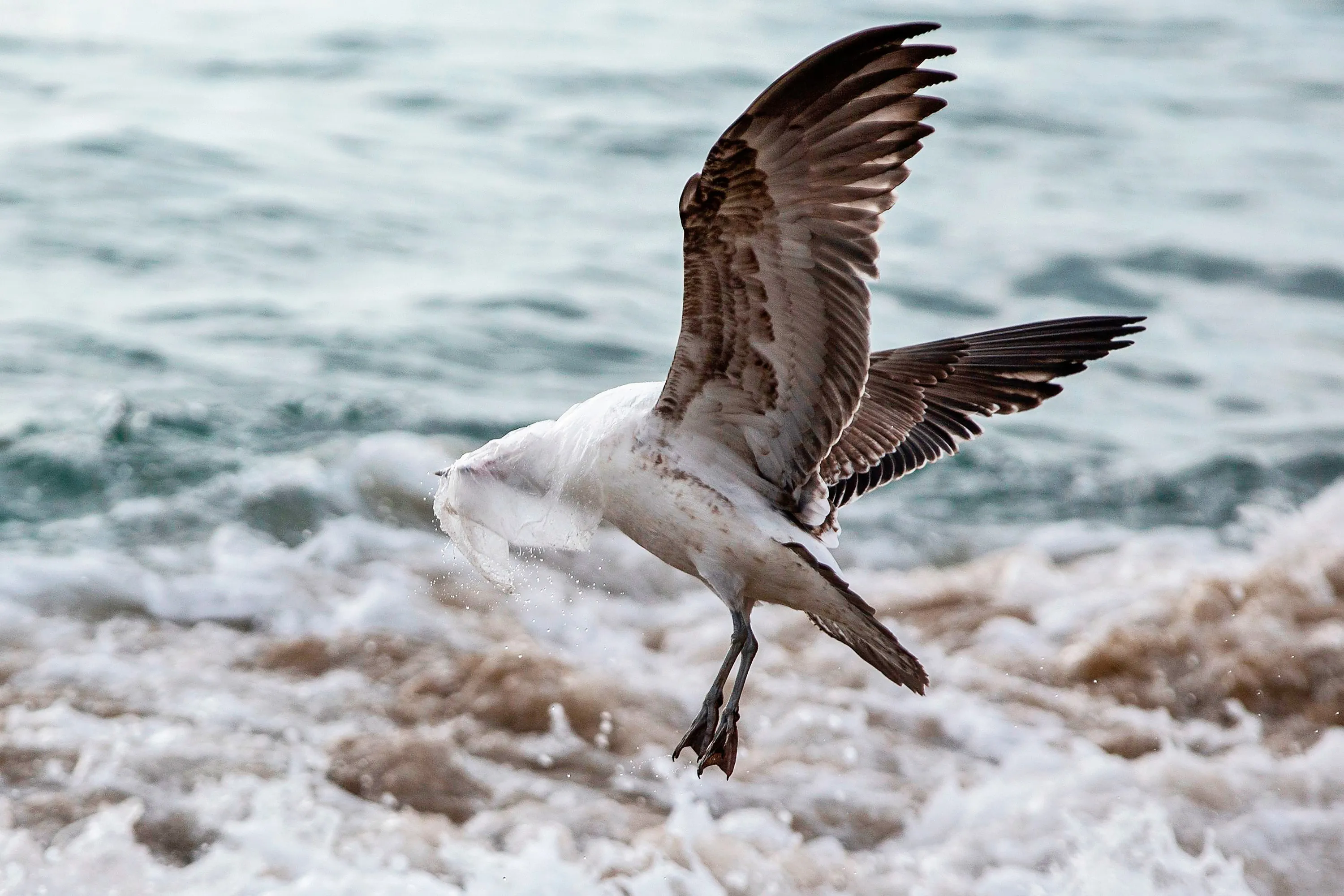 A seagull struggles to take flight covered by a plastic bag, on the seashore at Caleta Portales beach in Valparaiso, Chile on July 17, 2018. The international community has recently become far more sensitive to the environmental problems created in particular by single-use plastics. Chile has been one of the countries leading the way in Latin America against the use of plastic bags. In 2014 the government of Michelle Bachelet banned them in Chilean Patagonia and last year extended that to coastal areas, but now its days are numbered by law and a cultural change is needed. (Photo by Claudio Reyes/AFP Photo)