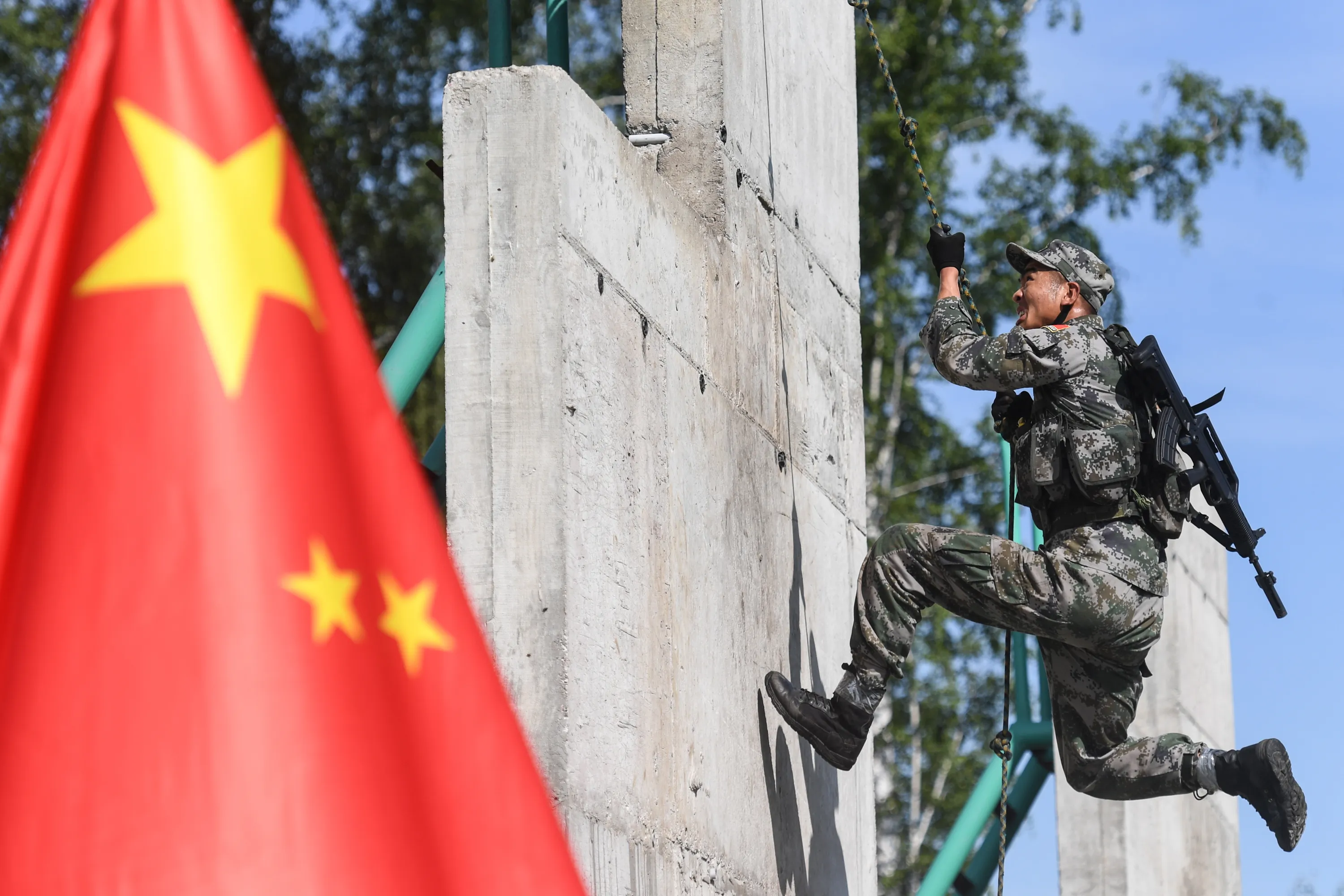 A serviceman of the Chinese People's Liberation Army (PLA) during the Scout Trail obstacle course, a stage of the Army Scout Masters competition among reconnaissance units, as part of the 2018 International Army Games at the Koltsovo range in Novosibirsk region, Russia on August 1, 2018. (Photo by Kirill Kukhmar/TASS via Getty Images)