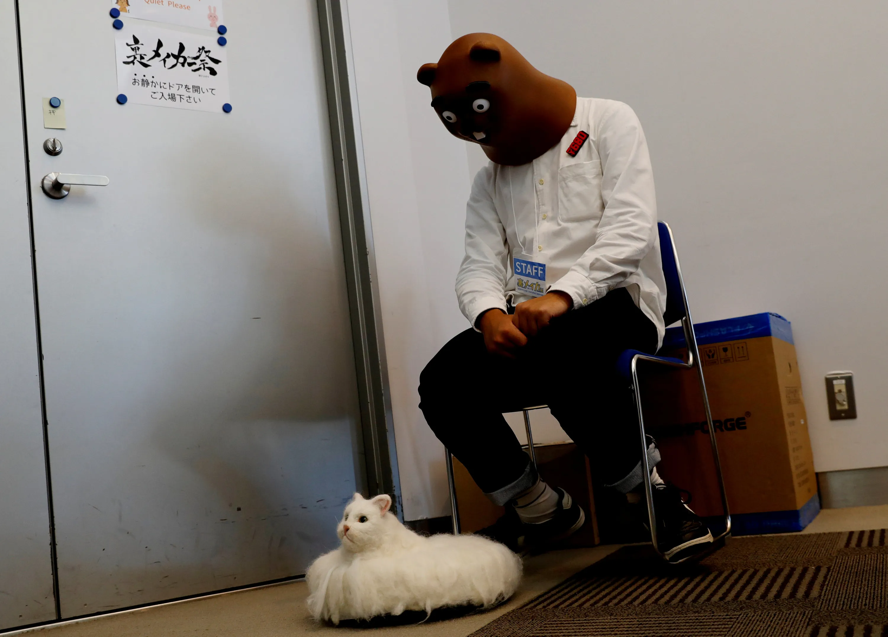 A man wearing Itachiguma mask looks at robot cat Ballon, which moves on the floor, at its photo opportunity during the Underground Maker Festival in Tokyo, Japan August 5, 2018. According to Japanese artist Daiki Sako who created the robot by combining a robot cleaner and body and head of a cat which made by handicraft, the robot was inspired by the video artworks “Welcome to Kitty City” by Cyriak. (Photo by Kim Kyung-Hoon/Reuters)
