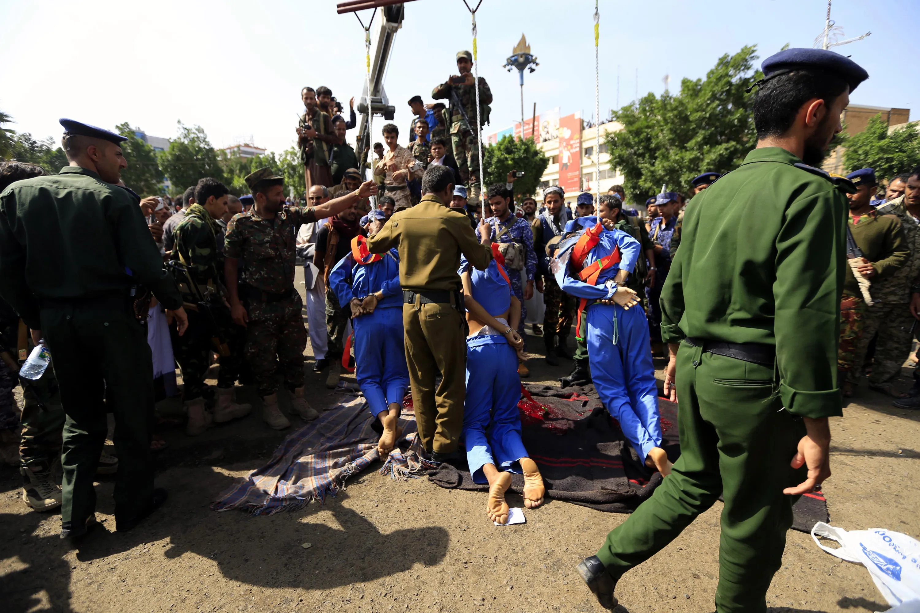People gather as three persons convicted of raping and murdering a ten-year old boy, are hanged on a crane after they being shot dead at a public square in Sana'a, Yemen, 08 August 2018. (Photo by Yahya Arhab/EPA/EFE)
